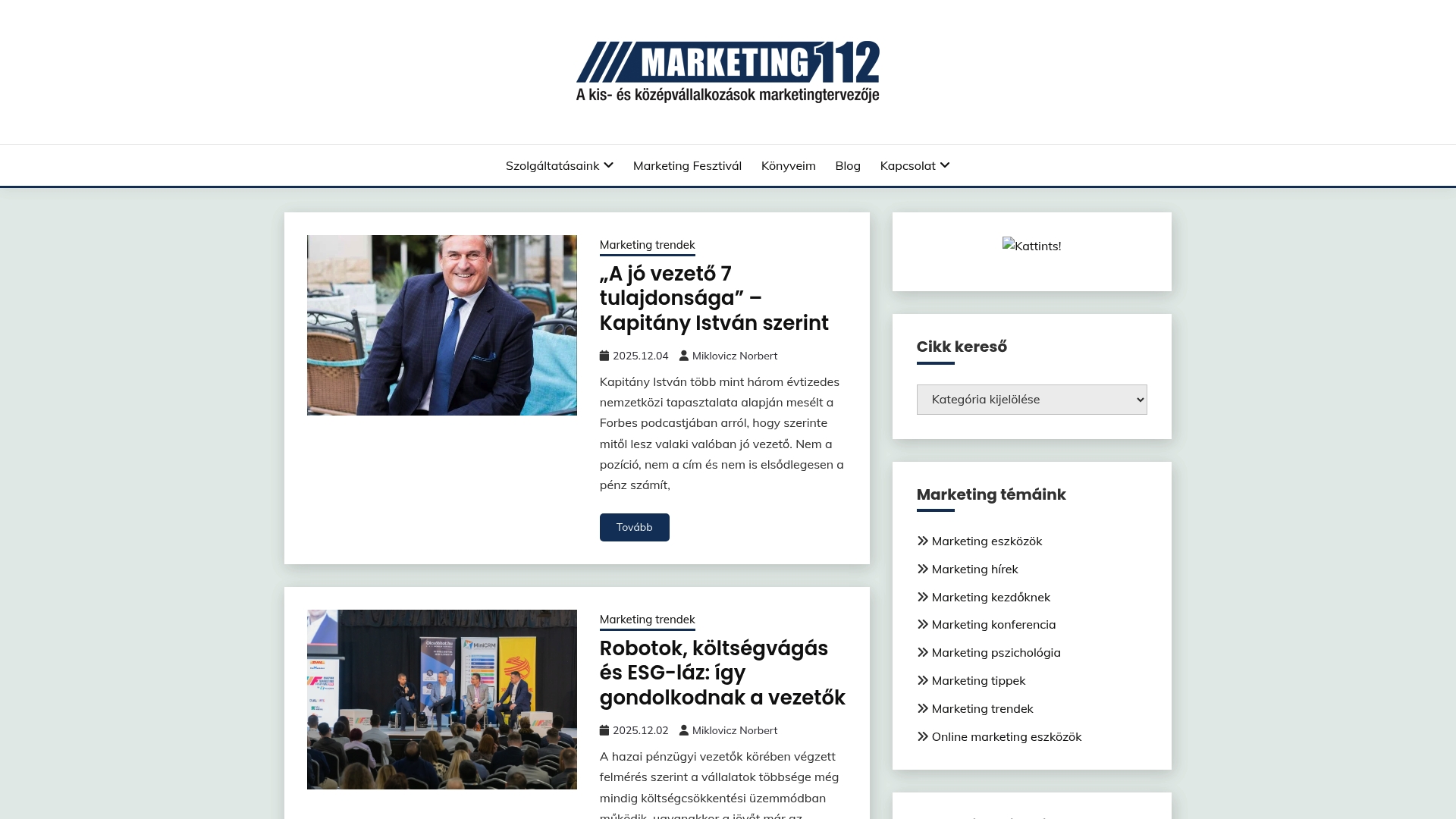 Marketing112 egy gyakorlatorientált marketingtartalom-forrás, amely kifejezetten kis- és középvállalkozások számára kínál naprakész ötleteket és stratégiákat. Röviden: folyamatosan frissülő trendfigyelés, digitális és közösségi média fókusz, valamint üzleti fejlesztési tippek vannak a középpontban. Ha gyors, alkalmazható iránymutatást keresel marketingkampányokhoz, jó helyen jársz. Nem helyettesít viszont egy teljes körű ügynökségi szolgáltatást.