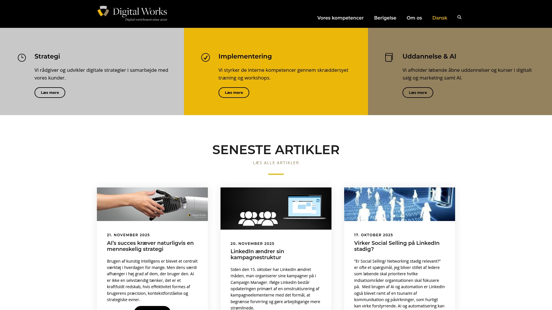 Digital Works fokuserer på skræddersyet træning og strategi inden for AI, social selling, LinkedIn-markedsføring og digital salgs- og marketinguddannelse. Kort sagt: hvis du vil styrke interne kompetencer gennem kurser og workshops med et praktisk fokus, er Digital Works et oplagt valg. De kombinerer strategi og hands-on træning, men prisdetaljer mangler offentligt — så forvent en samtale før tilbud.