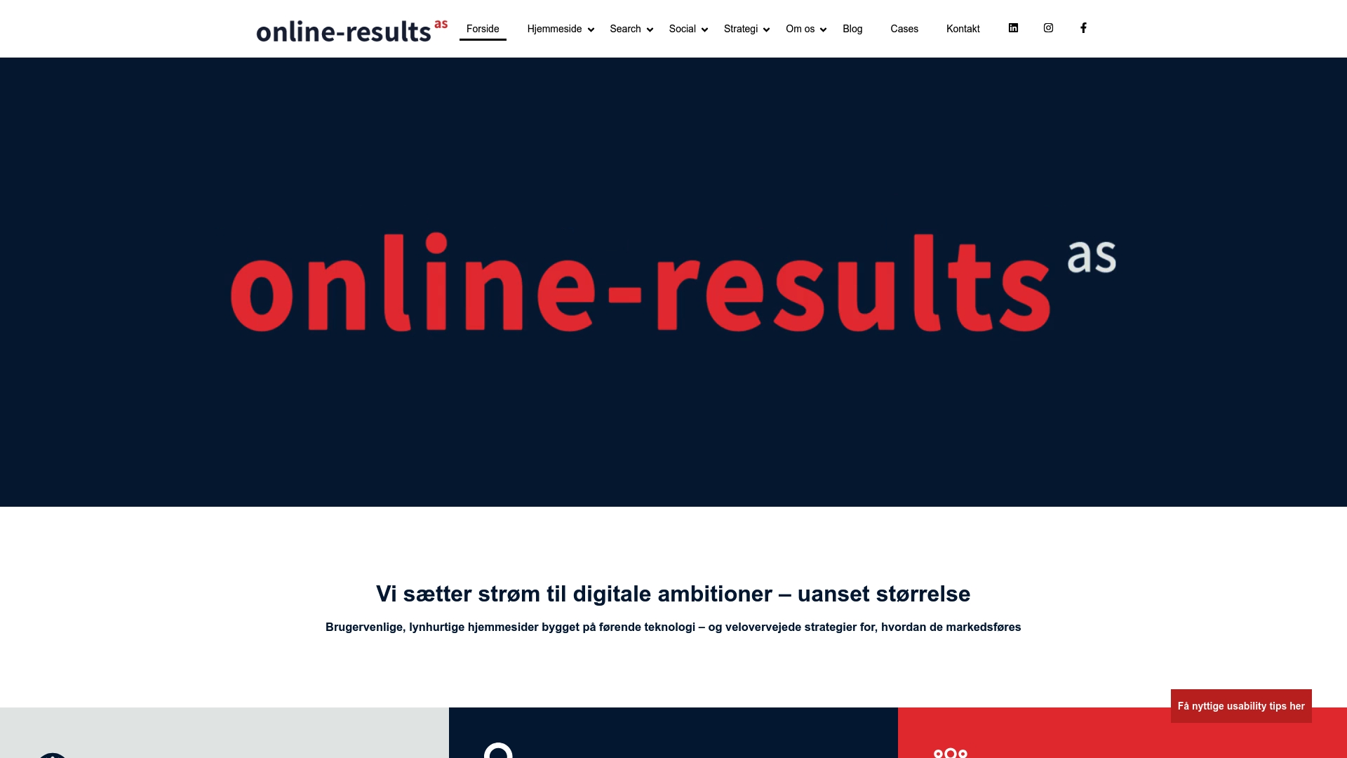 Online-Results tilbyder hjemmesider udviklet på førende teknologier med fokus på hastighed og brugervenlighed, samt search kampagner der inkluderer både SEO og betalte kanaler som Google Ads og Bing Ads. De kører social media kampagner på Facebook, Instagram og LinkedIn og leverer strategiudvikling for hele den digitale indsats. Endelig indgår analyser og evaluering af digitale aktiviteter som en fast del af tilbuddet, så du kan følge performance og justere indsatsen løbende.