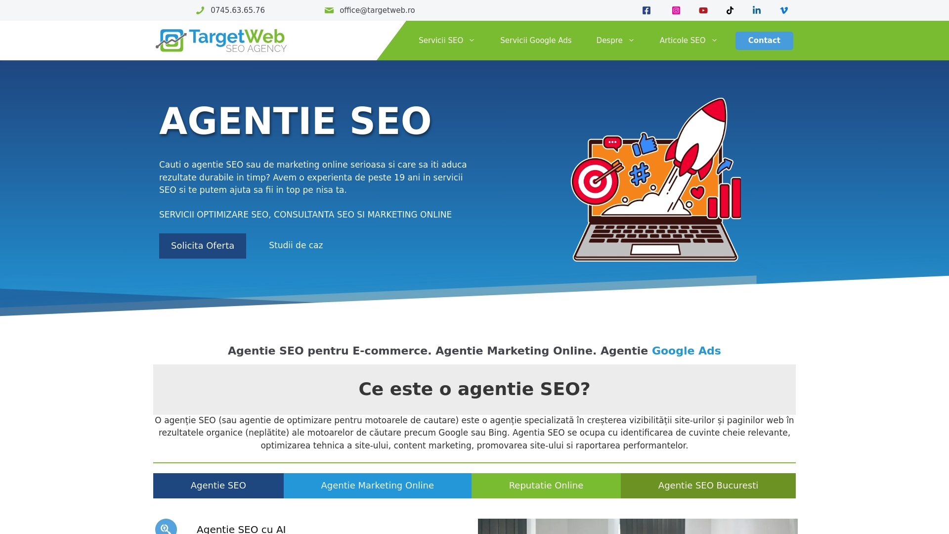 | TargetWeb | Optimizare tehnică, strategii AI | Experiență de 19 ani, abordare hibridă | Lipsă transparență prețuri | Prețuri personalizate, necesită contact direct |
