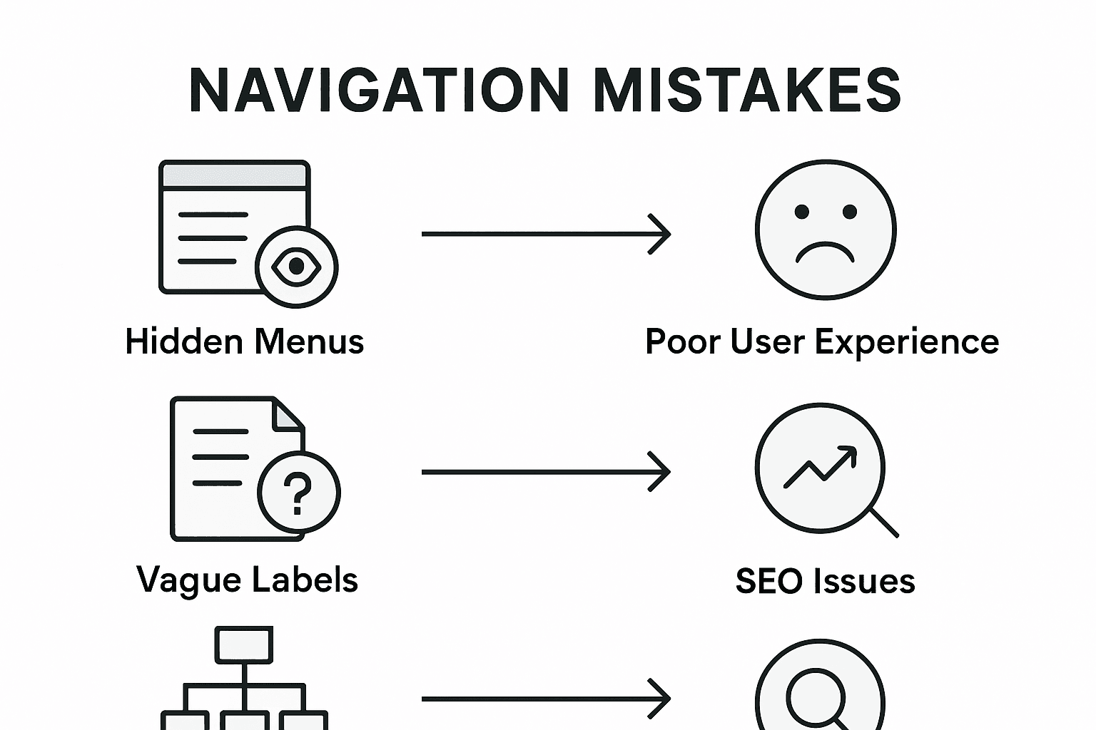 | Hidden or non-intuitive menus | Users miss key sections | Search bots miss important pages |