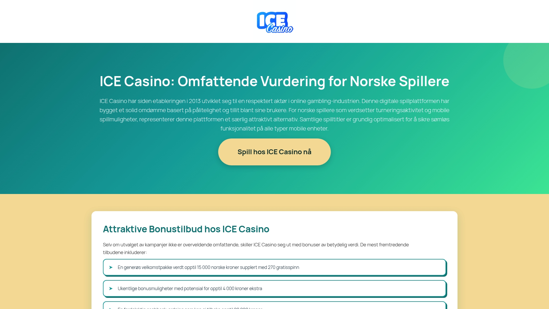 | Ice Casino Norge | Over 3500 spill, Sikkerhet, Mobiloptimalisering | Omfattende spillutvalg, Sterk mobilopplevelse | Ingen norsk lisens, Færre kampanjer | Registrering krever innskudd |