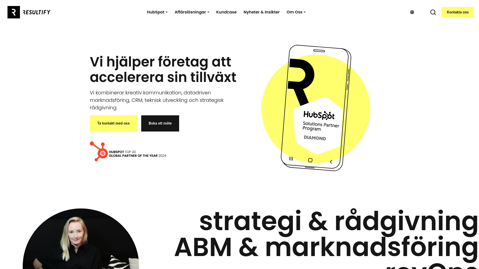 Resultify är en HubSpot-byrå med fokus på Nordiska företag som kombinerar kreativ kommunikation, data-driven marknadsföring, CRM, teknisk utveckling och strategisk rådgivning för att snabba på tillväxt. Bottom line: stark helhetskompetens kring HubSpot och tydligt fokus på mätbar affärsnytta, men det kräver att du redan har bestämt dig för HubSpot som plattform. Kort, koncist och målmedvetet.