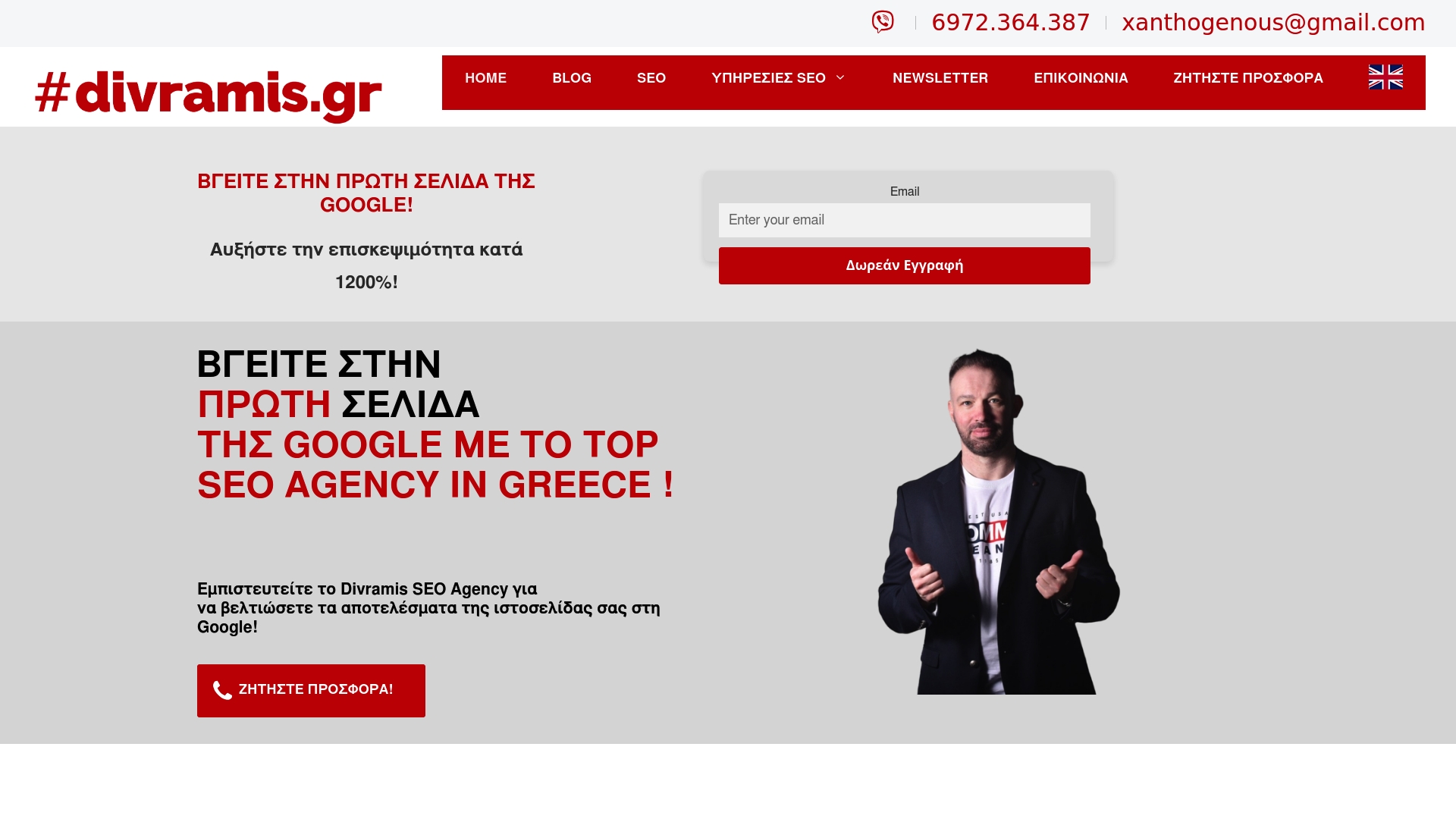 | Divramis SEO Agency | Mobile First Design, SEO Guarantees | Εμπειρία από το 2000, WordPress εξειδίκευση | Αναμονή για αποτελέσματα, Ασαφείς τιμές | Άγνωστη |