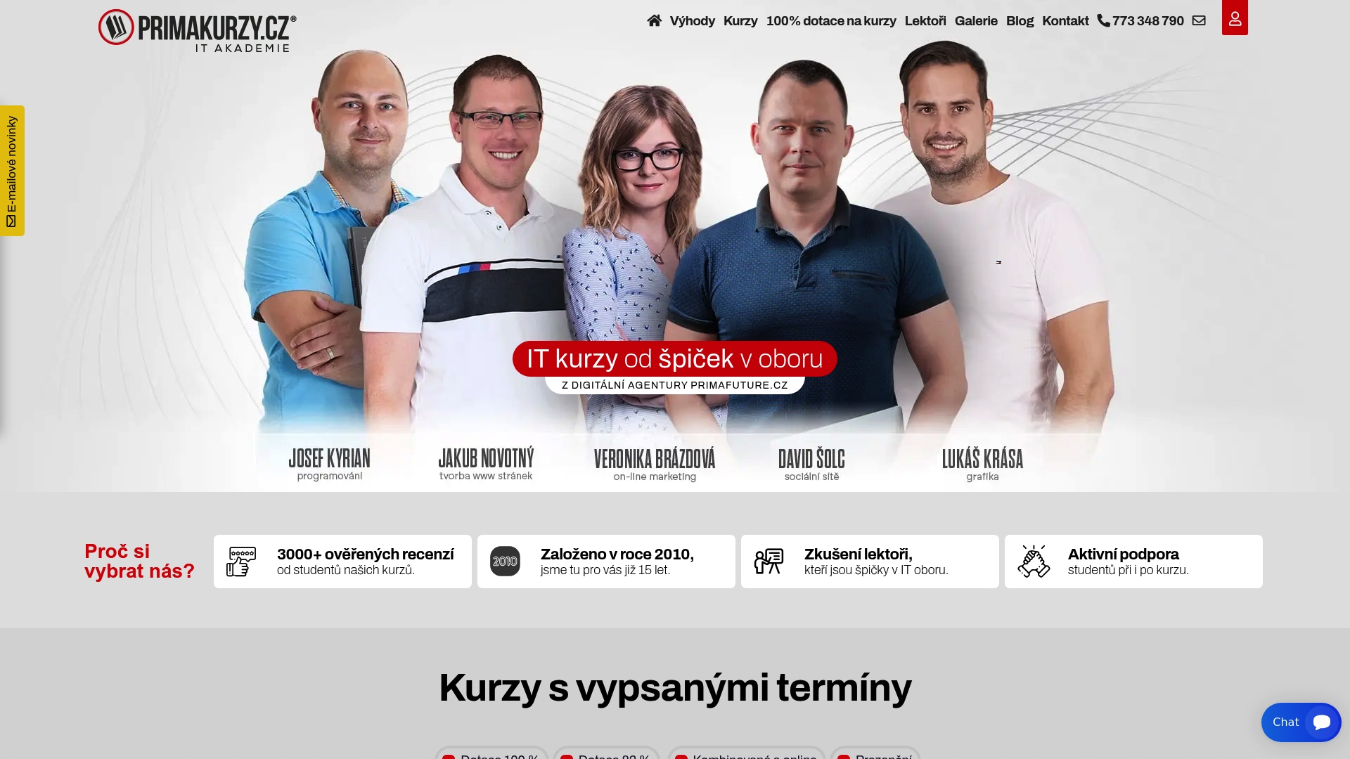 Primakurzy.cz poskytují akreditované kurzy s certifikátem, dlouhodobé programy v IT a digitálním marketingu, termíny s možností dotací a přímou podporou při vyřizování úhrady přes Úřad Práce. Kurzy vyučují lektoři s praktickou zkušeností a školení probíhají v prostorech vybavených moderní technikou; alternativou jsou kombinované nebo online formáty pro ty, kdo nemohou být fyzicky přítomní. Stručně: strukturované rekvalifikace s administrativní podporou.