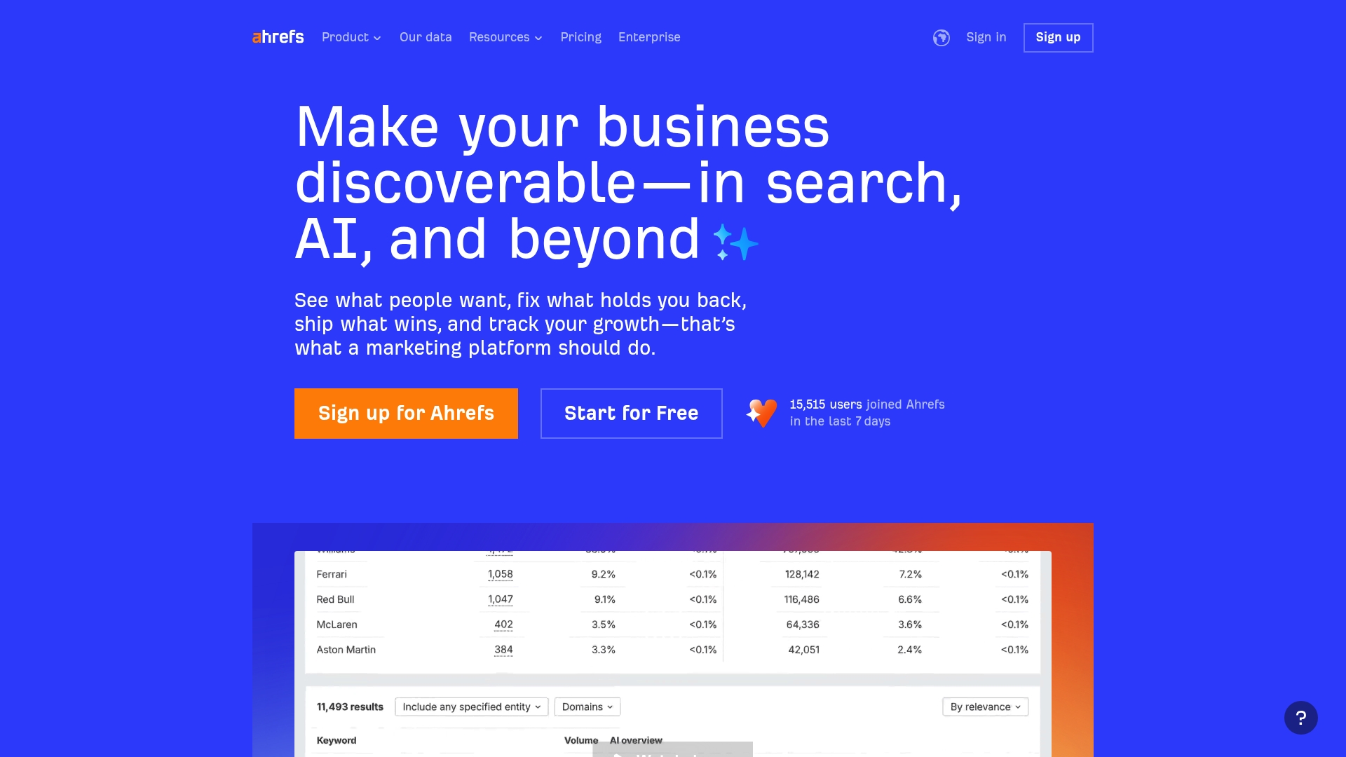 Ahrefs is an AI-driven marketing platform built on big data to help businesses improve discoverability across search and AI channels. It combines classic SEO tools—rank tracking, site exploration, and local SEO—with AI content helpers, social media management, and enterprise API access. The platform suits teams that need a single source for research, content optimization, and branded reporting. Bottom line: powerful and feature-rich, but it can be overkill for solo owners or very small businesses.