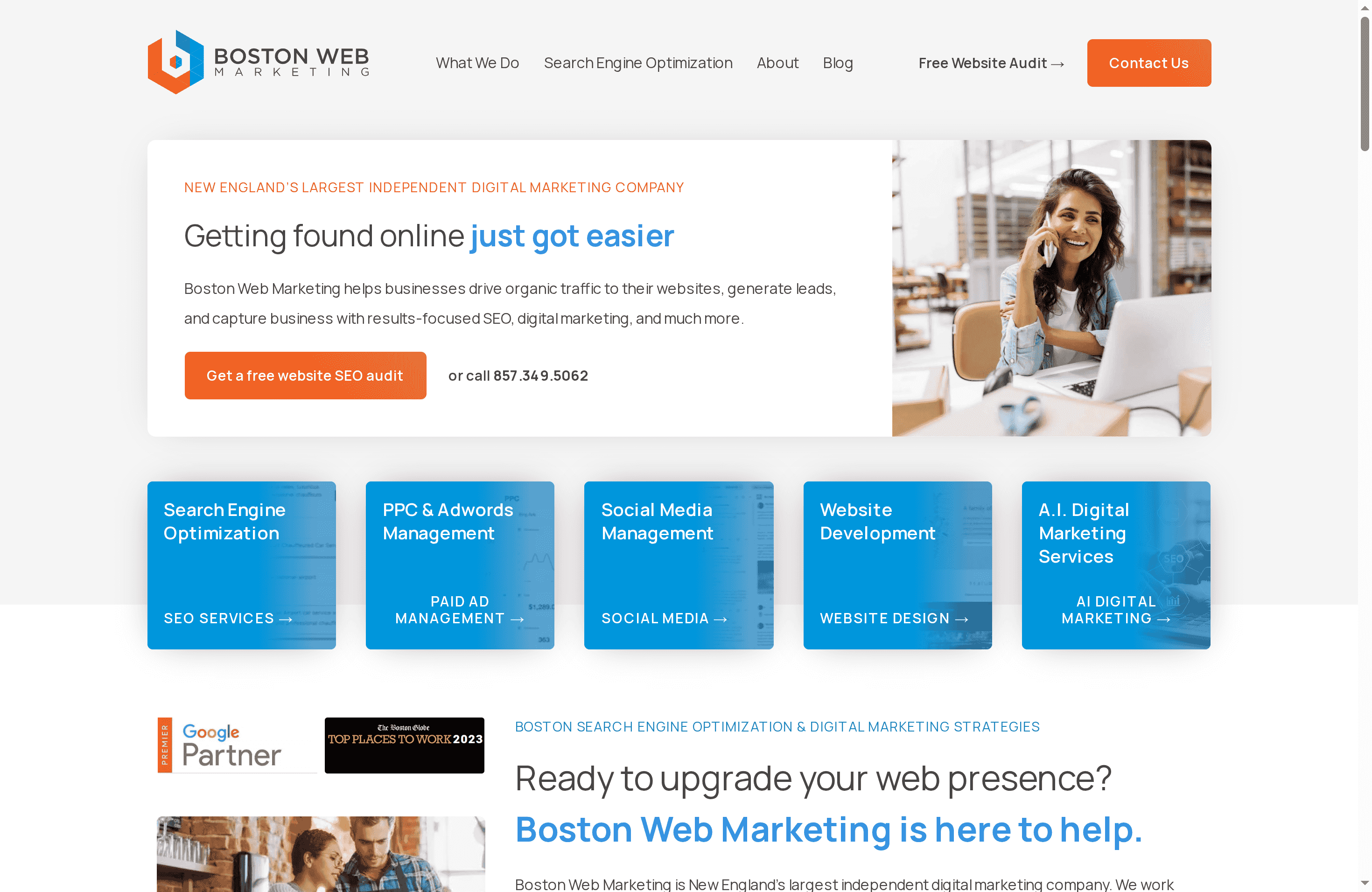 Boston Web Marketing is New England’s largest independent digital marketing agency, offering a full suite of SEO, web design, PPC, social media, and AI-driven services. Their model emphasizes data-driven strategies, dedicated account representatives, and measurable reporting, with a free website SEO audit as an entry point. Bottom line: it’s a strong full-service option for businesses that want centralized digital marketing support and hands-on account management, though pricing transparency is limited.