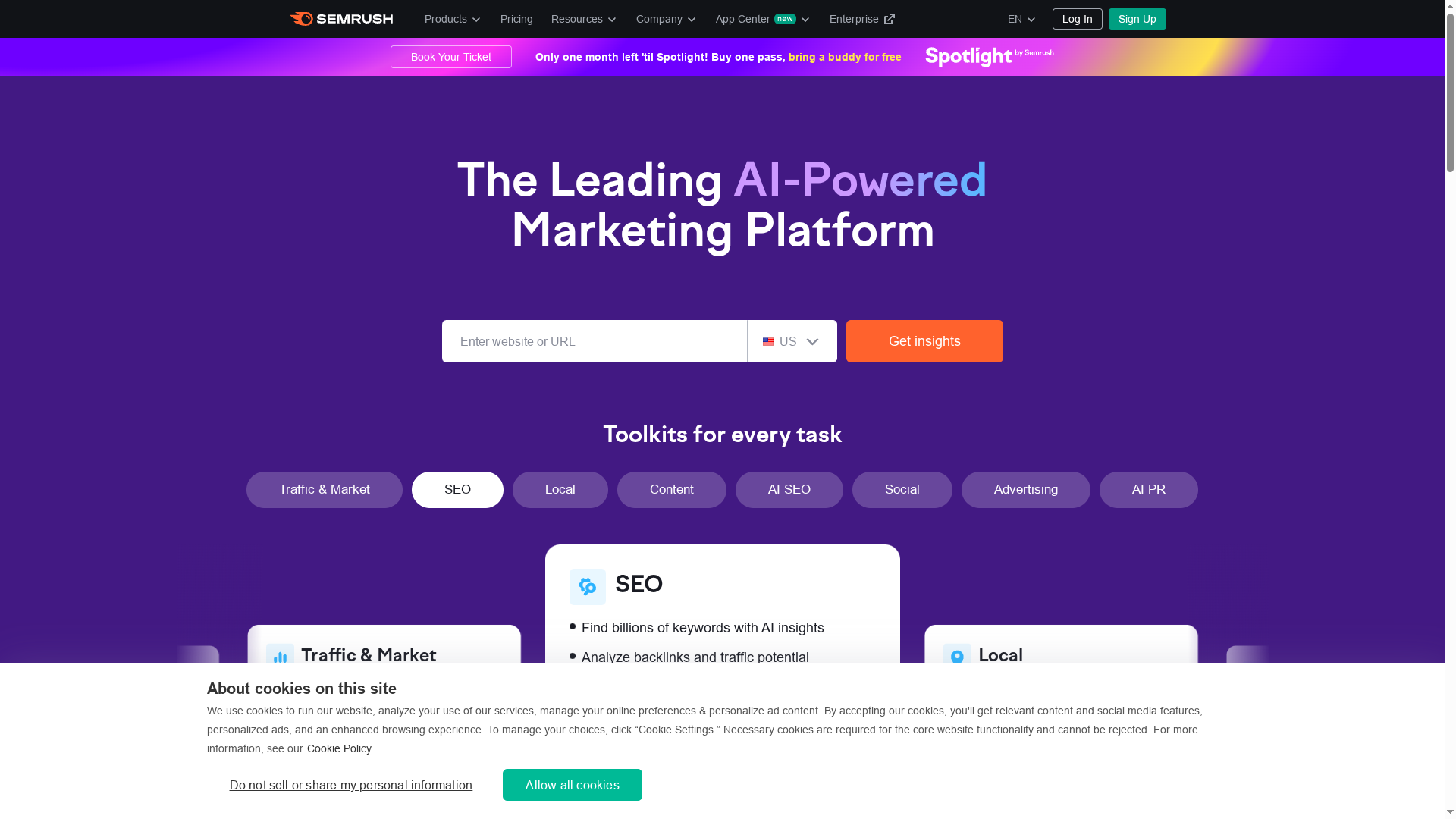 SEMrush provides AI-powered marketing capabilities across SEO, content, traffic and market analysis, advertising, social media, local marketing, and PR. Key functionality includes keyword research, backlink analysis, technical SEO audits, rank tracking, competitor benchmarking via traffic and audience data, local Google Business Profile optimization and directory listings, plus content creation and optimization features with AI-driven readability and insight suggestions.