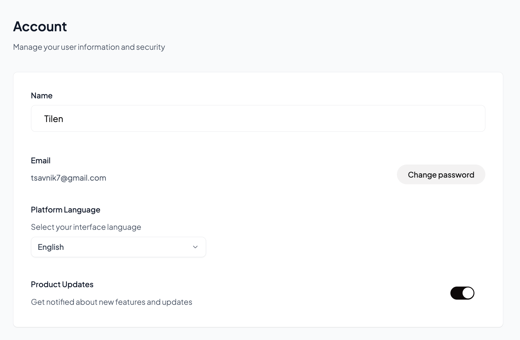 Platform Language: Select your preferred interface language (English, Spanish, French, German).