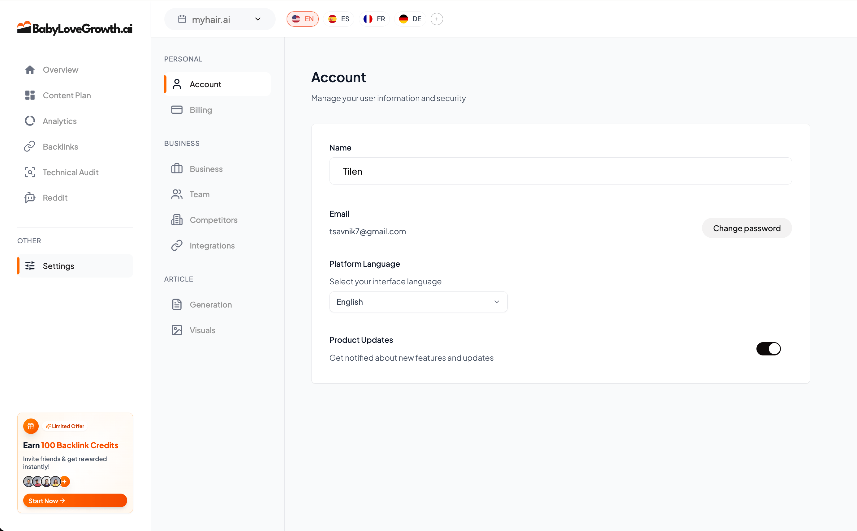 Configure your account, manage your team, set up integrations, and control how articles are generated and styled.