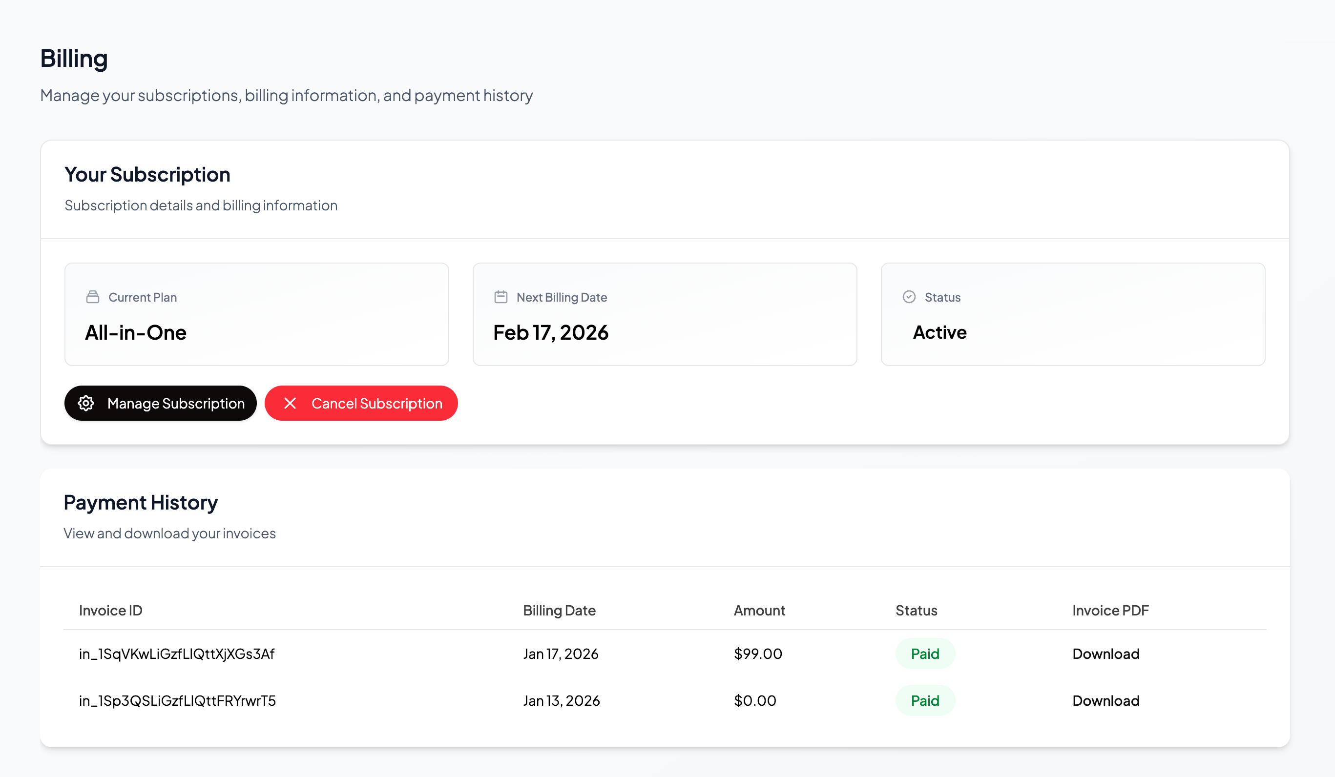 Payment History: View all past invoices with dates, amounts, and status. Download invoice PDFs for your records.