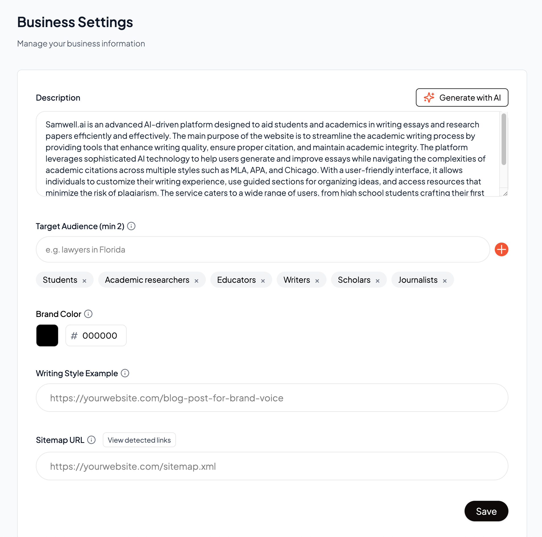 Brand Color: Set your primary brand color using a hex code. This is used in generated visuals and article elements.