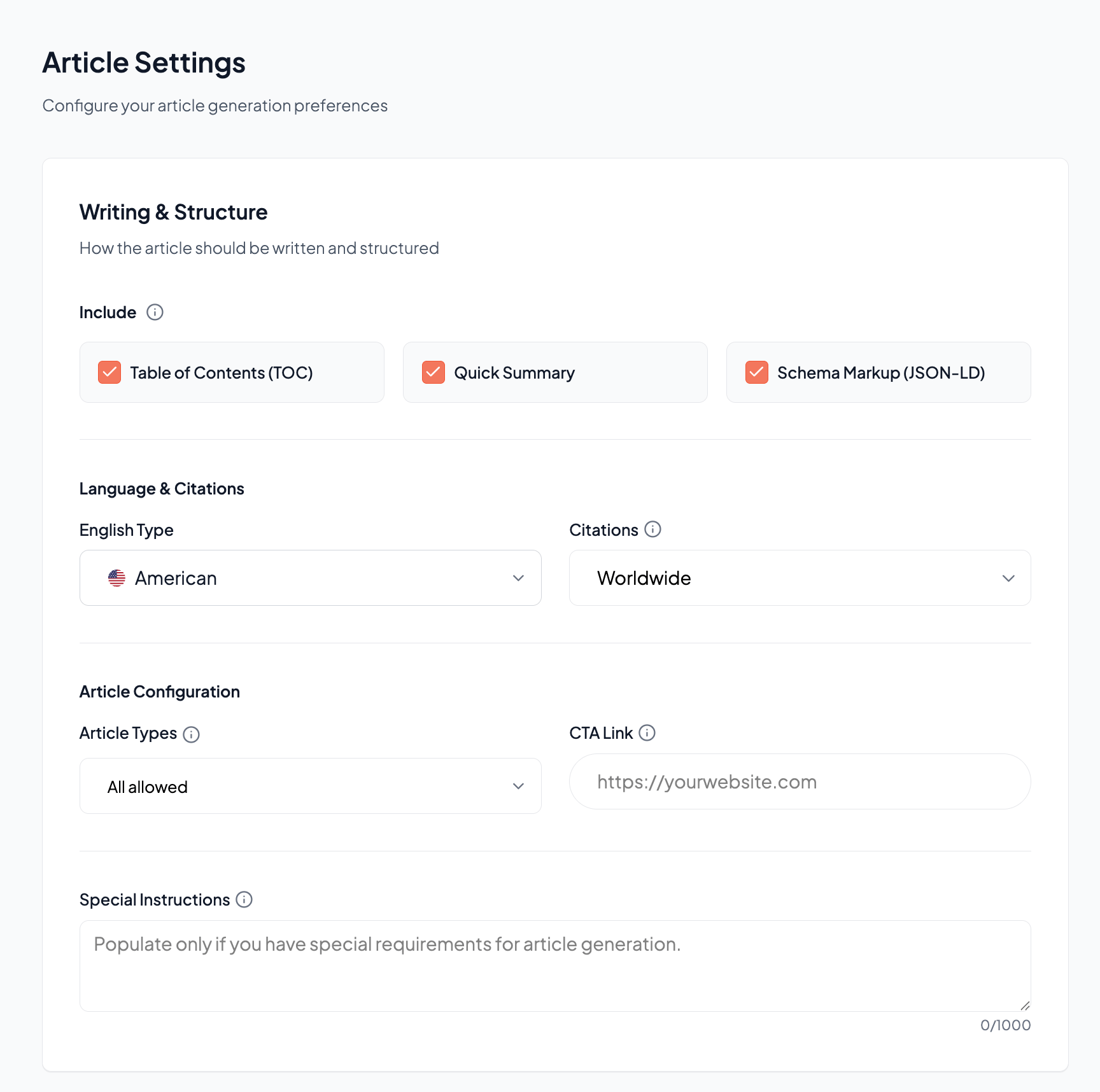 Special Instructions: Add custom instructions that apply to all generated articles (up to 1000 characters).