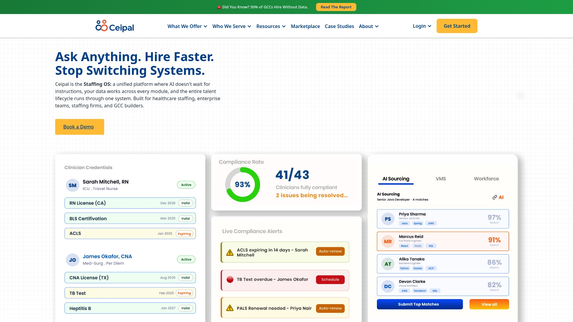 Ceipal är en allt-i-ett staffing OS som kombinerar Applicant Tracking System (ATS), Vendor Management System (VMS) och Workforce Management med AI-driven matchning för rekrytering. Plattformen passar bemanningsbyråer och hälso- och sjukvårdsorganisationer som vill minska manuellt arbete och korta fyllnadstider.