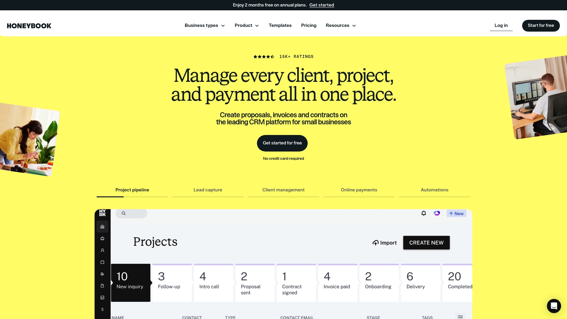 HoneyBook alapvető képességei közé tartozik az ügyfélkezelés CRM-eszközökkel, online számlázás és fizetések kezelése, valamint ajánlatok és szerződések kiállítása digitálisan aláírható formában. Emellett integrálható naptárral az ütemezéshez, és rendelkezik automatizációval és AI-alapú javaslatokkal, amelyek feladatokat és munkafolyamatokat könnyítenek meg. Ez az összeállítás kifejezetten azoknak hasznos, akik egyetlen felületen szeretnék átlátni a leadtől a fizetésig tartó folyamatot.