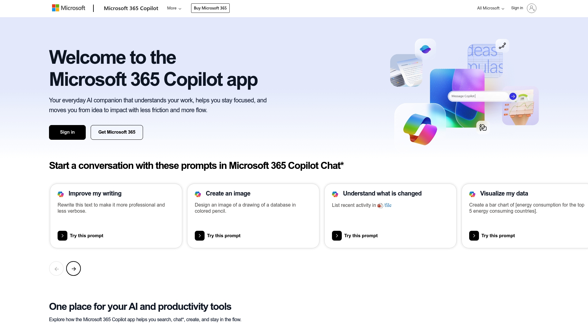 Microsoft 365 Copilot tarjoaa AI-avusteista kirjoittamista ja sisällön hiomista, kuvien luontia valmispohjilla sekä datan visualisointia ja kaavioiden luomista. Lisäksi se seuraa aktiivisuutta ja listaa viimeisimpiä tiedostoja sekä tarjoaa AI-chatin, joka tiivistää, hahmottelee luonnoksia ja auttaa ideoiden tutkimisessa pyynnöstä. Kaikki tämä on integroituna Microsoft 365 -sovelluksiin kuten Wordiin, Exceliin, PowerPointiin ja Outlookiin, mikä tekee siirtymisistä sujuvia ja vähentää kontekstinvaihtoa.