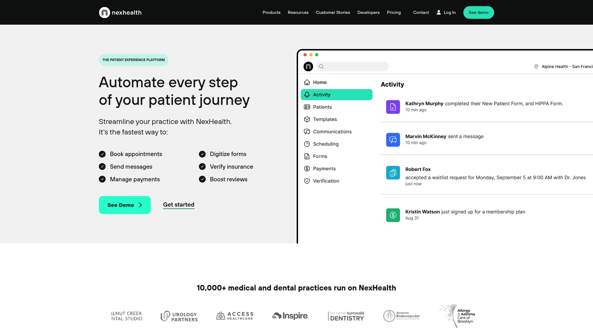 NexHealth tarjoaa verkkoajanvarauksen ja aikataulun hallinnan, automatisoidut viestintäkampanjat sekä digitaalisten potilaslomakkeiden käsittelyn. Alusta tukee turvallisia verkkomaksuja ja reaaliaikaista vakuutustarkistusta sekä arvostelu- ja palautetyökaluja. Lisäksi NexHealth integroituu useisiin potilastietojärjestelmiin ja mahdollistaa käytäntökohtaisesti räätälöitävät työnkulut ja henkilökohtaiset tilaukset ilman pakollisia pitkän aikavälin sopimuksia.