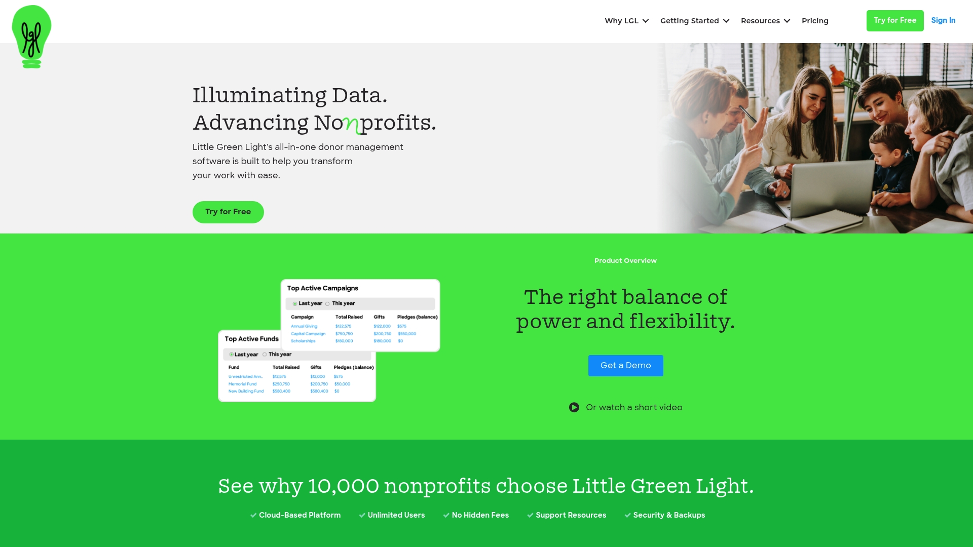 Little Green Light on pilvipohjainen lahjoittajahallinnan työkalu, joka on suunniteltu keskikokoisille ja suuremmille voittoa tavoittelemattomille organisaatioille, jotka haluavat siirtää hajanaiset taulukot keskitettyyn järjestelmään. Alusta tukee rajoittamatonta käyttäjämäärää, tarjoaa helpon siirtymäprosessin ja panostaa näkyvyyteen ja tietojen varmuuskopiointiin. Hinta alkaa pienemmistä segmenteistä, mutta suuri tietomäärä voi kasvattaa kustannuksia. Kokonaisuus sopii erityisesti organisaatioille, joiden prioriteetti on selkeästi datan konsolidointi ja joustavat integraatiot.