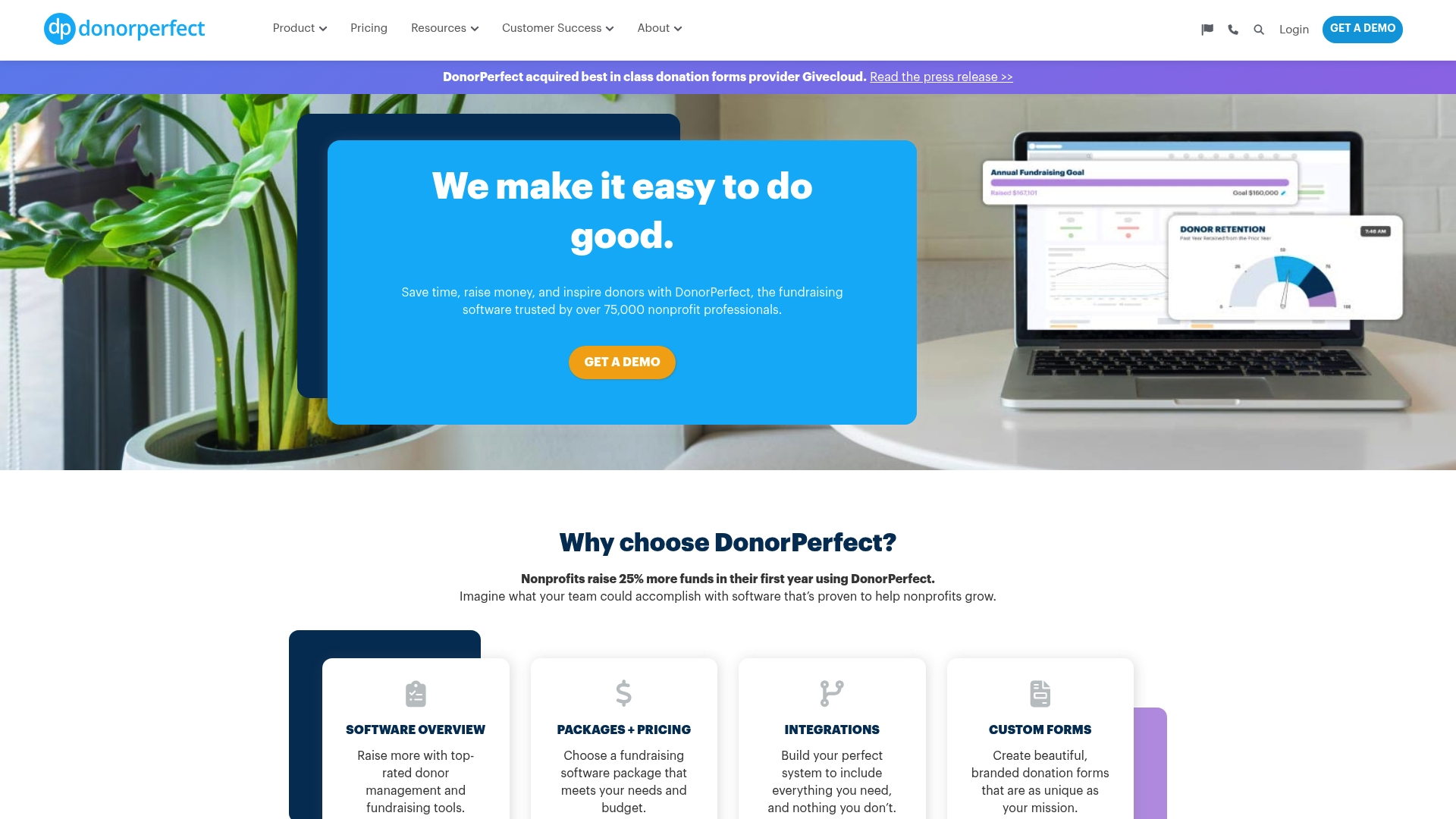 DonorPerfect yhdistää peruslahjoittajahallinnan ja edistyneet varainhankintatyökalut: mukautettavat lahjoituslomakkeet, verkkoyhteensopiva ja mobiili lahjoitusten vastaanotto, kuukausilahjoitusohjelmat sekä tapahtumien hallinta. Kommunikointi onnistuu sähköpostilla, sosiaalisessa mediassa ja postitse, ja automaatiot sekä hälytykset vapauttavat aikaa rutiinitehtäviltä. Järjestelmä tarjoaa myös mukautettavat raportit ja kojelaudat, maksunkäsittelyn työkaluja sekä integraation Constant Contactin kanssa digitaaliseen markkinointiin.