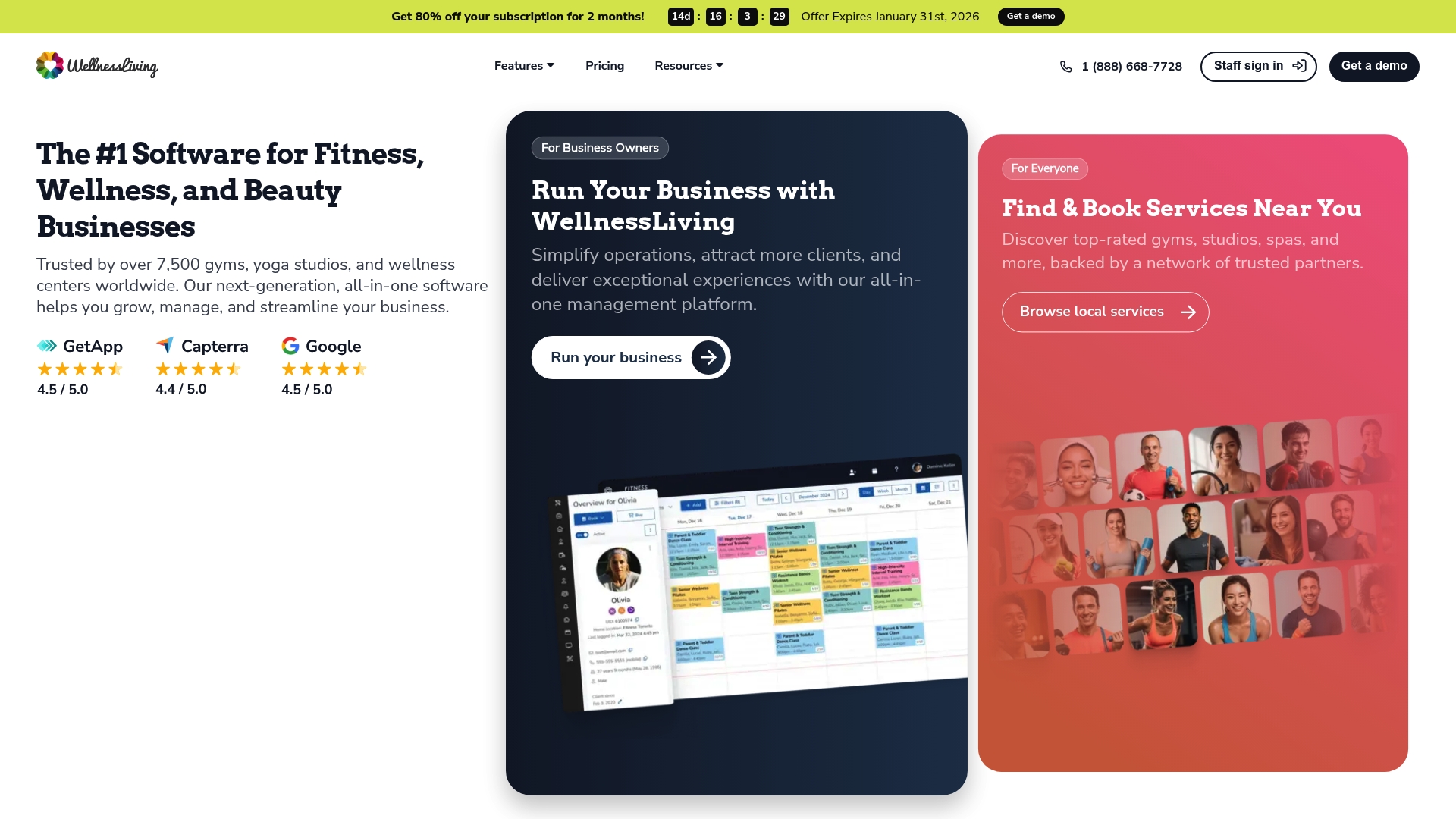 WellnessLiving kombinerer booking og planlegging (inkludert online booking, arrangementshåndtering og self check-in) med bred virksomhetsstyring som personaladministrasjon, kundedatabase og avansert rapportering. Markedsføringsmodulene tilbyr e-post- og SMS-kampanjer, lead-håndtering og henvisningsprogrammer, mens klientopplevelsen støttes av merkevarede apper og selvregistrering. Betalingsfunksjoner inkluderer integrert POS, kortbehandling og gavekort, noe som gjør det enkelt å samle inn inntekter og spore salg.