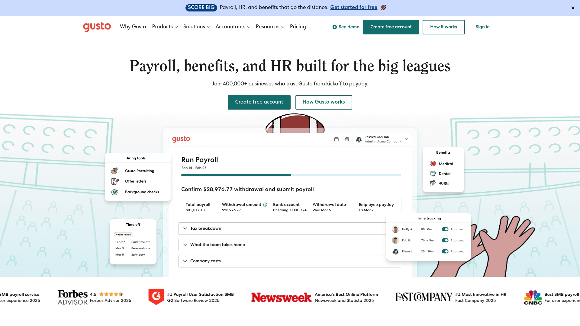 Gusto combina elaborazione paghe automatizzata con gestione dei benefit e strumenti di onboarding per nuove assunzioni. Include anche dichiarazioni fiscali e conformità integrate e funzioni base di rilevazione presenze e gestione permessi. L'aspetto operativo è pensato per togliere compiti ripetitivi al team fondatore e centralizzare paghe, benefit e anagrafiche in un unico posto. Questo porta a meno errori e a una gestione più ordinata dell'amministrazione del personale.