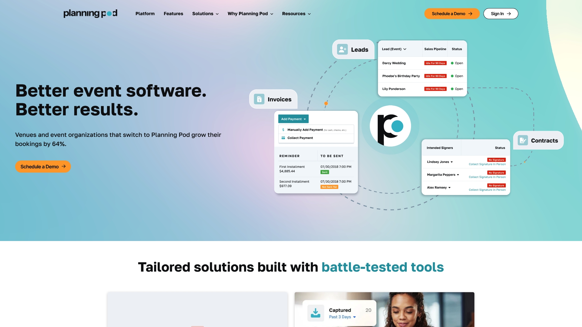 Planning Podin ydinlupaus on yhdistää yli 40 työkalua tapahtumien koko elinkaarelle yhdelle räätälöitävälle alustalle. Se lupaa vähentää manuaalista työtä ja keskittää tiedot — yhden näkymän kautta voit seurata varauksia, laskutusta ja suorituskykymittareita.
