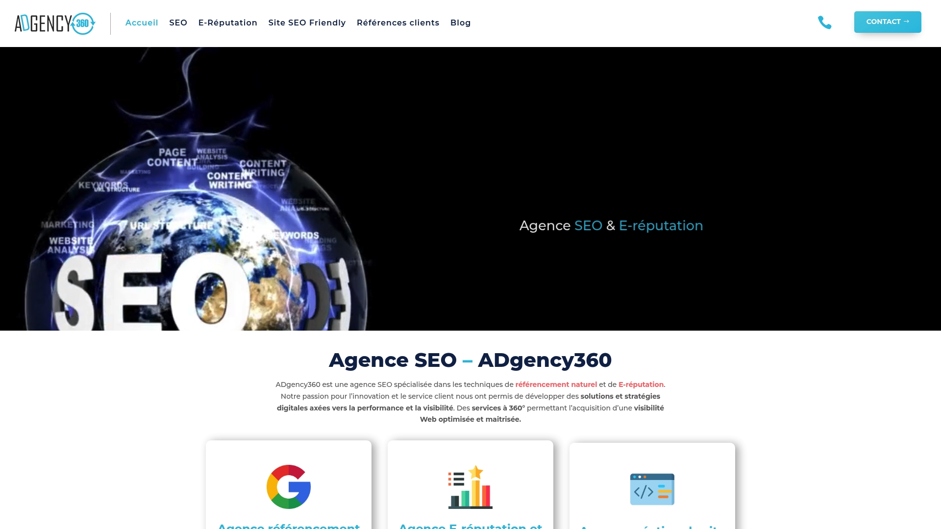 | ADgency360 | Audit SEO complet, optimisation technique et gestion de la réputation en ligne. | Approche globale, suivi personnalisé, création de sites optimisés SEO. | Tarifs non précisés, résultats SEO demandant du temps. | Sur devis selon projet. |