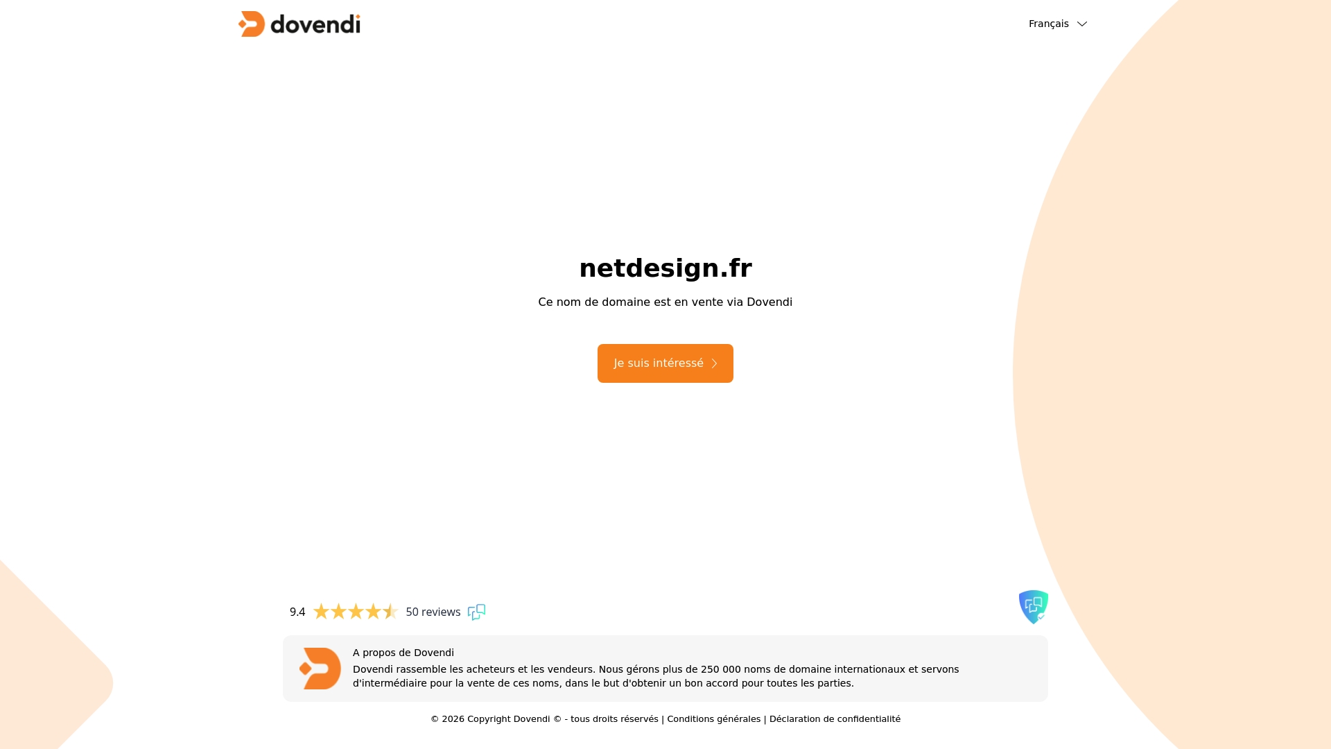 Netdesign.fr est présenté comme un nom de domaine en vente via Dovendi, qui agit comme intermédiaire pour acheter et vendre des domaines. La plateforme affiche une note de 9.4/10 sur 50 avis et gère 250 000 noms de domaine.