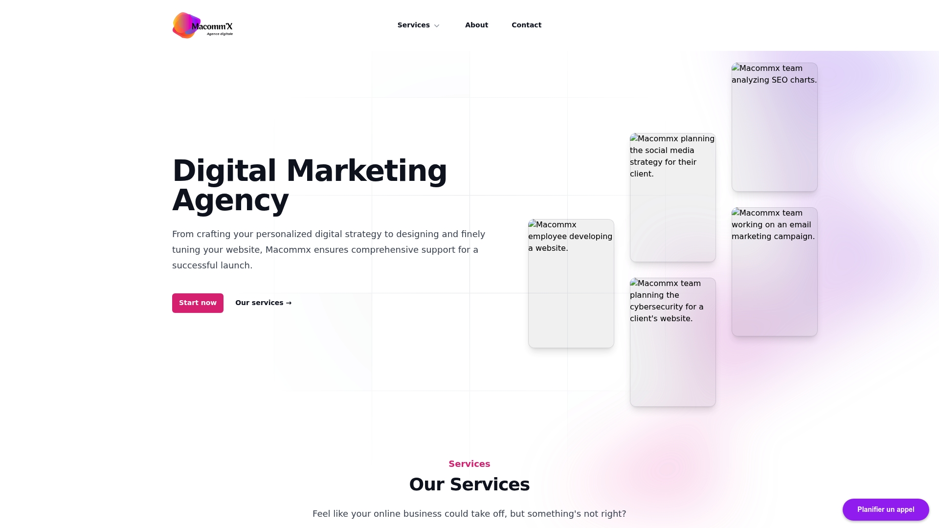 Macommx fournit création ou optimisation de sites web, référencement naturel et payant, stratégie réseaux sociaux, marketing par email et services de cybersécurité. L’agence promet un accompagnement global depuis le lancement jusqu’à la promotion et la protection de la plateforme numérique.