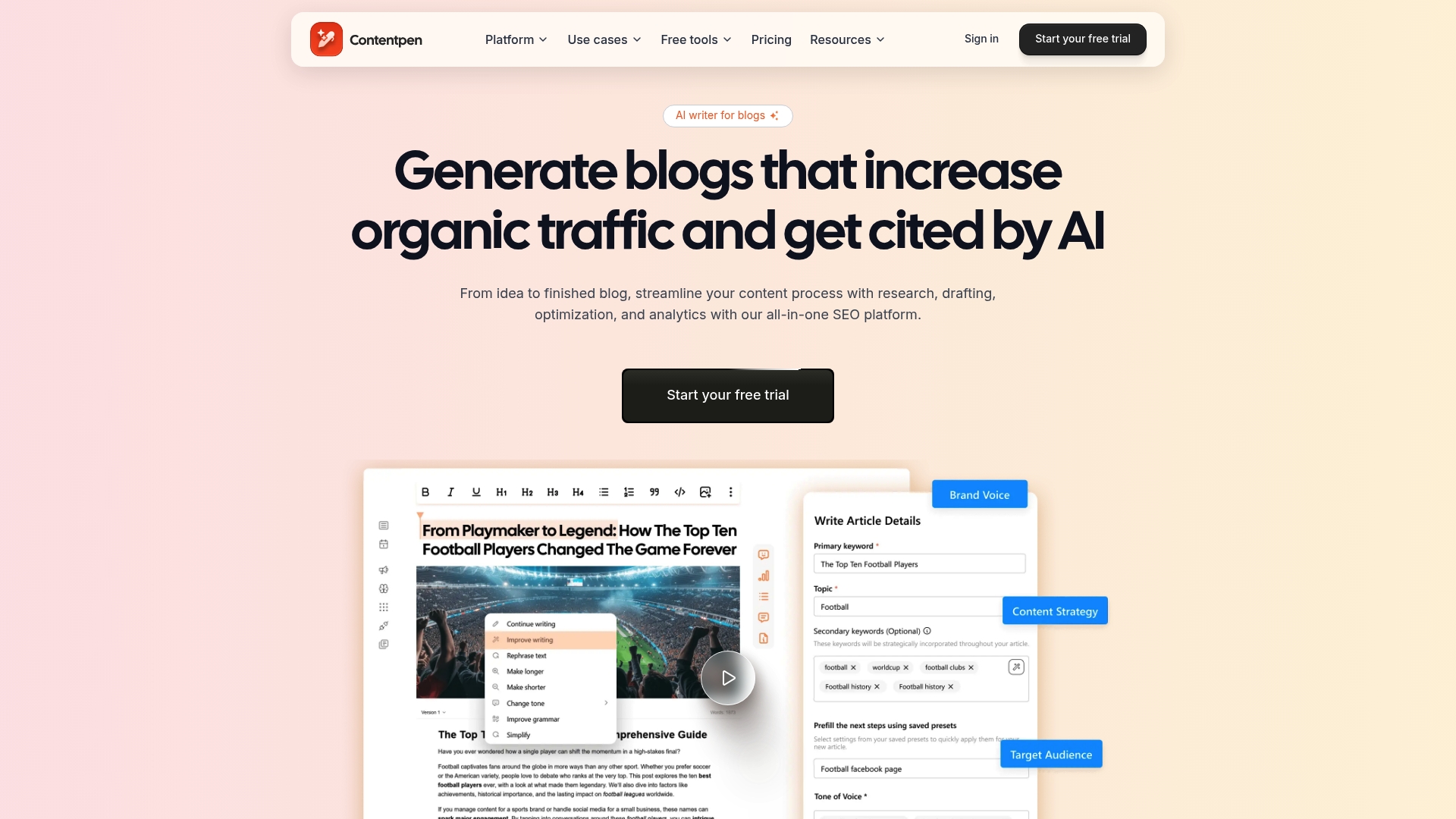 | Contentpen | Génération d'articles AI, score SEO, placement liens internes, suivi SERP | Intégration AI et SEO, plans variés, outils gratuits, capacités d'automatisation | Qualité IA limitée, tarifs élevés pour solo, nécessite compétences SEO | Starter 27 $/mois |