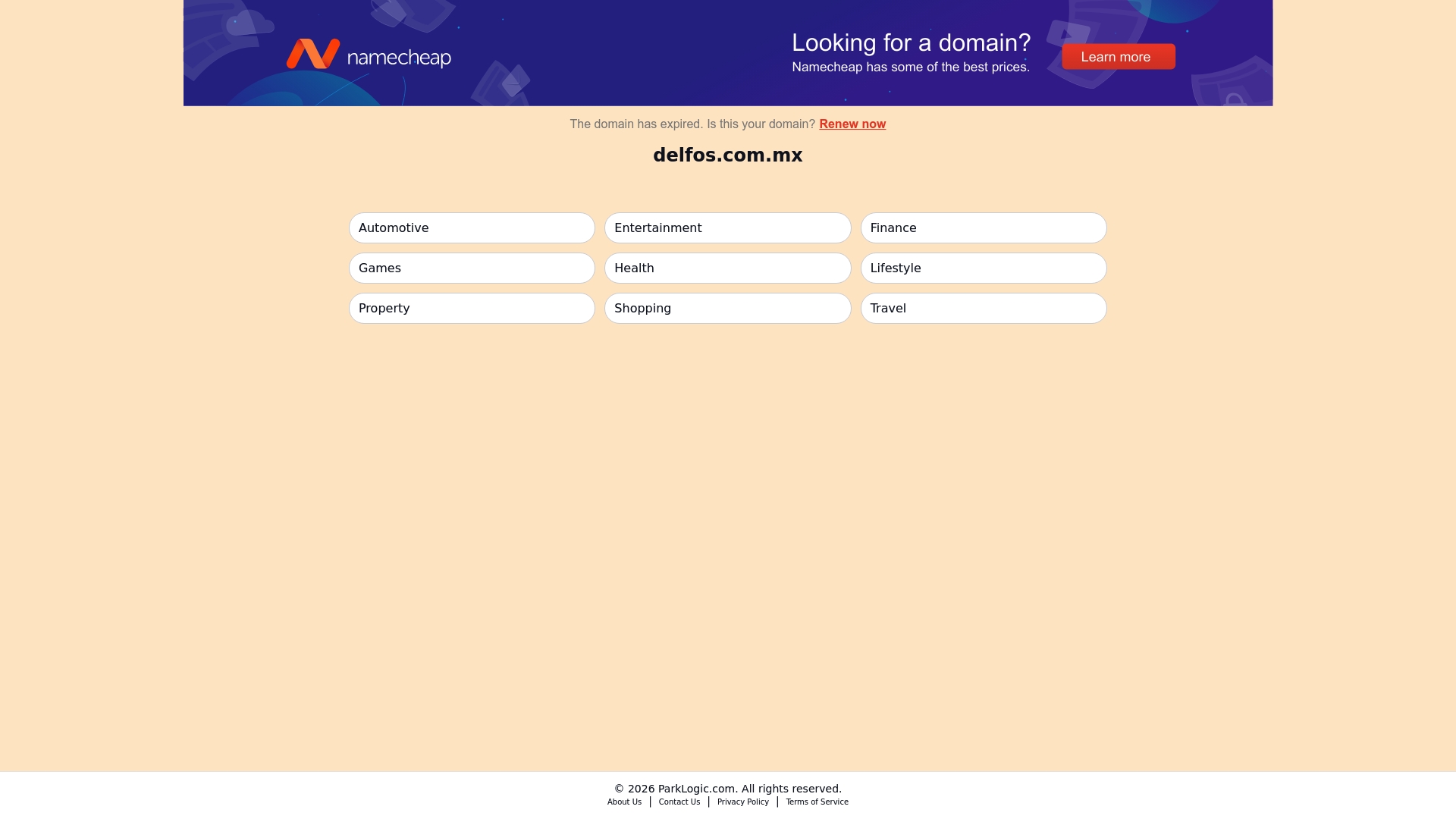delfos.com.mx aparece como un dominio expirado y estacionado gestionado por ParkLogic, con enlaces categorizados hacia varias temáticas. No ofrece un producto activo ni servicios de agencia de marketing digital, sino una página de parking orientada a monetizar tráfico.