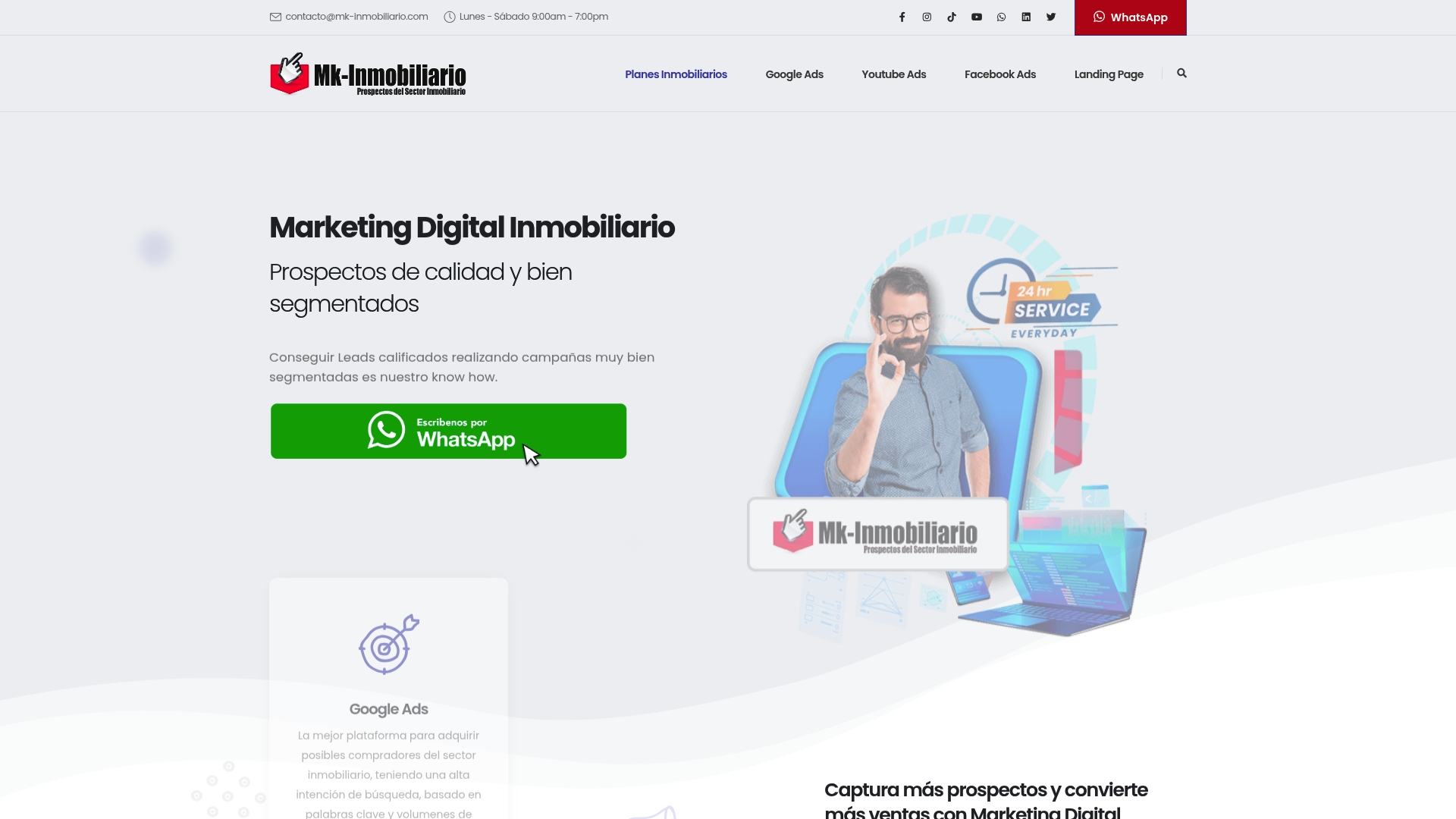 Mk-Inmobiliario se centra en prospecting y generación de leads para el sector inmobiliario mediante campañas en Google Ads, Facebook Ads y YouTube Ads, además de crear landing pages para captura de contactos. La agencia entrega informes mensuales con ajustes continuos y ofrece planes personalizados para agentes y desarrolladores.