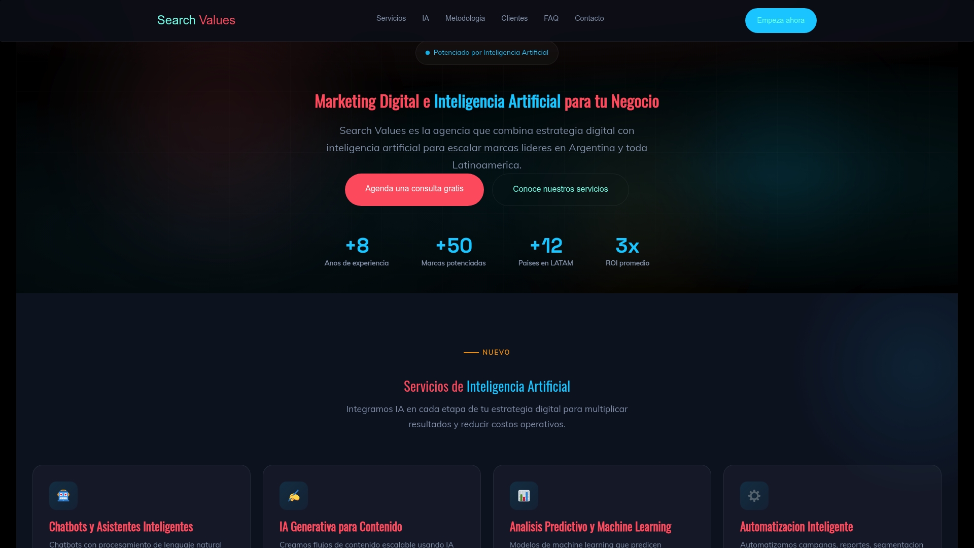La propuesta de Search Values combina estrategia digital y capacidad técnica en IA con experiencia regional en Latinoamérica. Esa mezcla permite lanzar campañas automatizadas, contenidos escalables y atención constante sin depender de múltiples proveedores.