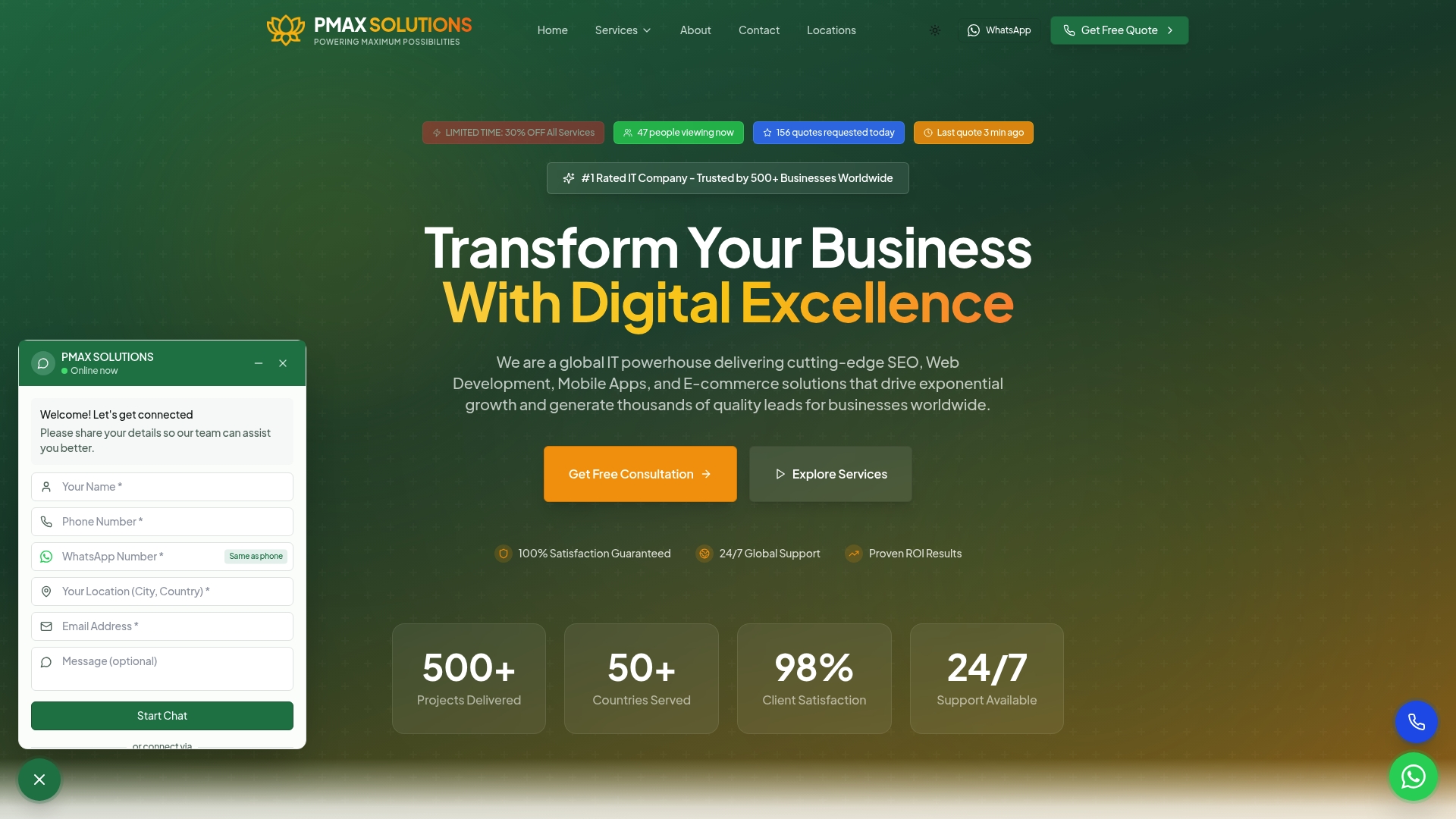 La agencia entrega soluciones de extremo a extremo: SEO, Desarrollo Web, Apps móviles, E-commerce y soluciones empresariales personalizadas. Reportan ciclos de desarrollo rápidos y resultados orientados a retorno de inversión, junto con soporte global en más de 50 países.
