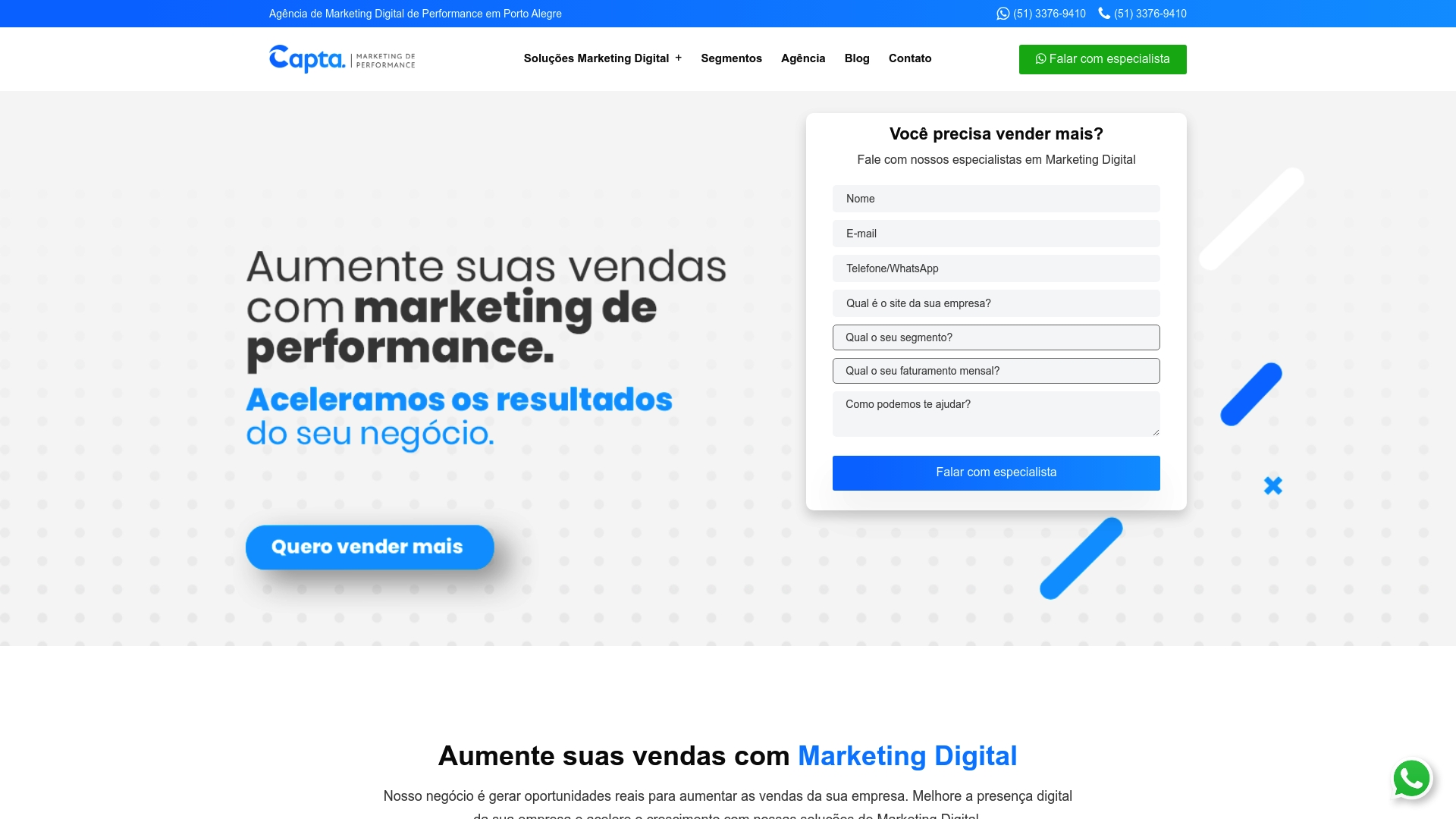 A Agência Capta apresenta-se como uma agência de performance com certificação do Google Partners e equipa com analistas certificados pelo Google. A proposta centra-se em gerar leads qualificados e acelerar vendas através de Google Ads, SEO e criação de landing pages e sites. Para empresas em Vila Velha que procuram resultados orientados por métricas, a Capta oferece uma abordagem integrada e focada em conversões. Contacto direto via WhatsApp facilita a comunicação durante a execução das campanhas.