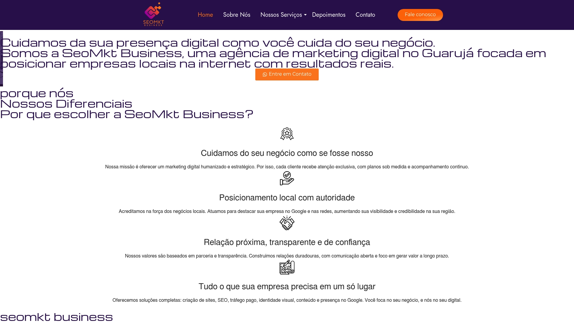 SeoMkt Business apresenta-se como uma agência local do Guarujá focada em dar visibilidade e credibilidade a negócios da região. O serviço combina várias disciplinas do marketing digital com atendimento humanizado, ideal para quem procura um parceiro próximo e estratégico.