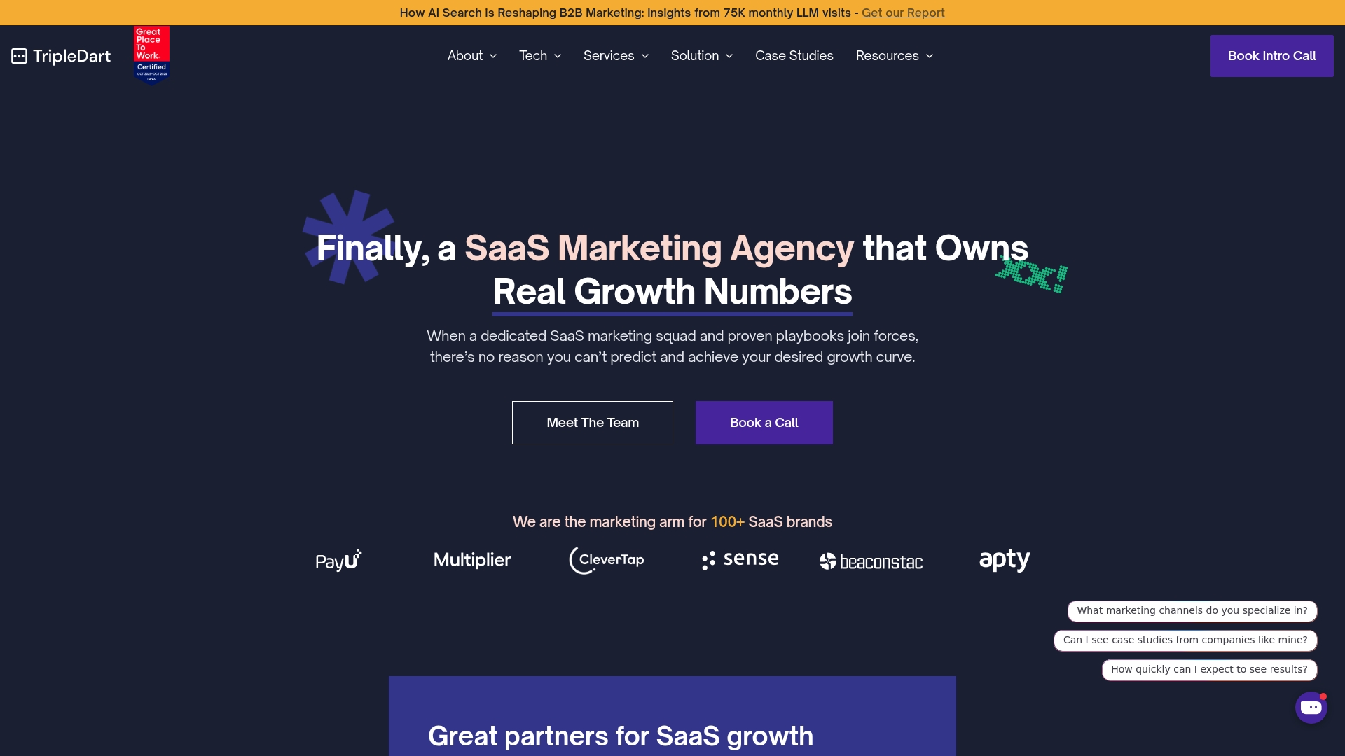 TripleDart é uma agência SaaS que combina marketing orientado por dados com uma oferta abrangente de serviços para empresas de Software como Serviço. Trabalham SEO, content marketing, PPC, Development & Design, RevOps e PR com playbooks de crescimento pensados para escalabilidade. São apresentados como parceiros de longo prazo para startups, scaleups e empresas maduras que procuram resultados mensuráveis. A promessa central é transformar investimento em crescimento previsível através de tecnologia e automação.