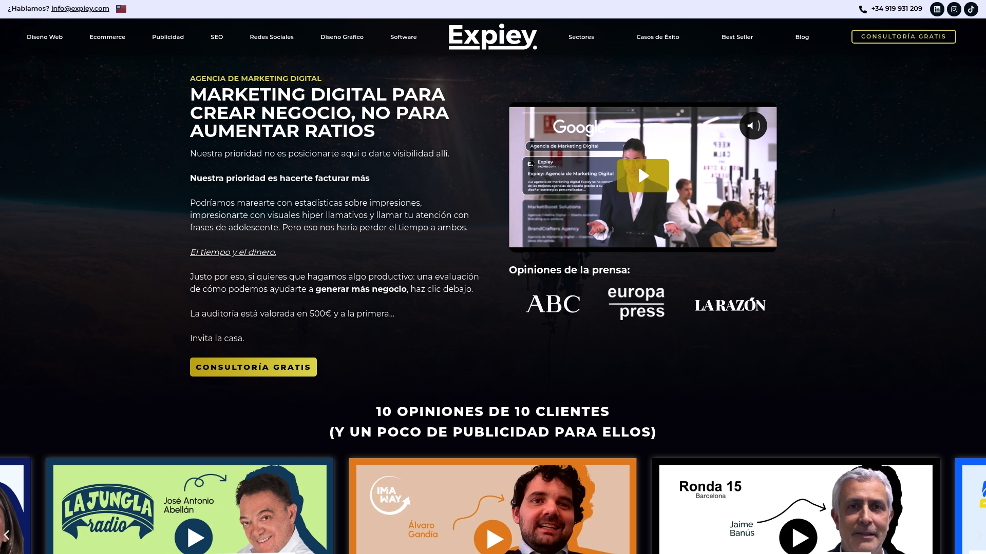 Expiey ofrece una combinación amplia de servicios: estrategia basada en datos con su Method Data Map, planes de marketing digital personalizados, diseño web, SEO, SEM, gestión de redes sociales y desarrollo de software. Atiende a clientes de distintos tamaños y mantiene presencia en Madrid, Valencia y Barcelona, además de trabajar con compañías a nivel internacional. Incluye una sesión de consultoría gratuita que sirve para analizar y mejorar la presencia digital antes de empezar el proyecto.