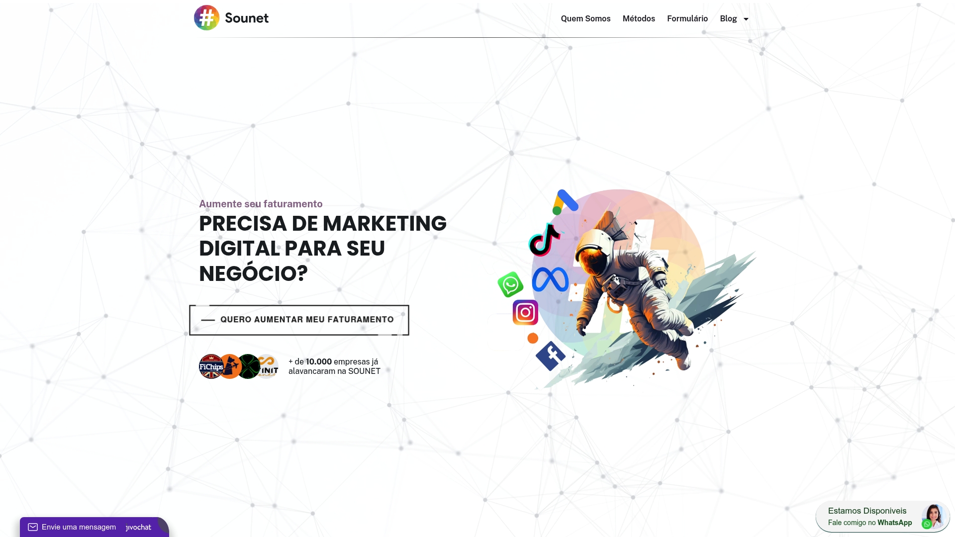 Sounet é uma agência certificada Google Partner que oferece soluções personalizadas de marketing digital para empresas que querem crescer online. A abordagem combina tráfego pago com criação de sites e CRM, ideal para quem aceita investir para obter resultados mensuráveis.