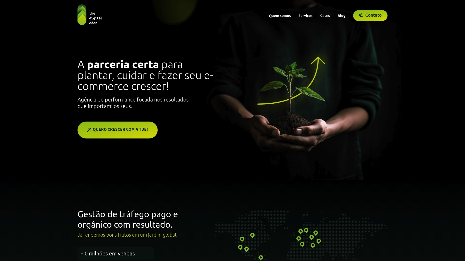 A The Digital Eden (TDE) apresenta-se como uma agência de performance focada em resultados concretos para e‑commerce. Tem abordagem integrada que combina gestão de tráfego pago e orgânico com criação de conteúdo e monitorização de dados.