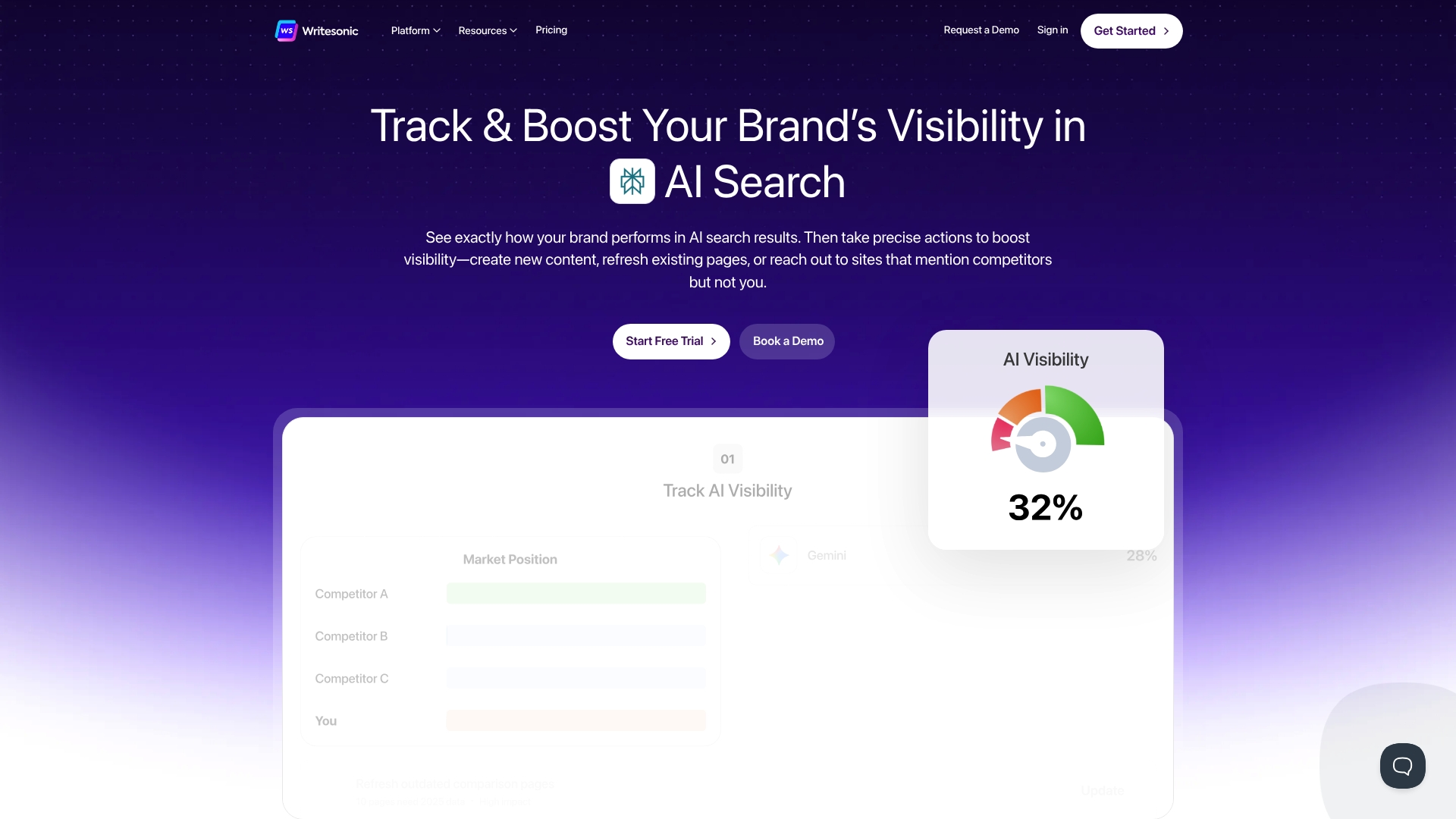 Writesonic è una piattaforma AI completa pensata per chi vuole migliorare visibilità e posizionamento su Google e su assistenti conversazionali come ChatGPT e Claude. Offre strumenti di creazione contenuti, tracciamento della visibilità AI e correzioni SEO tecniche automatiche.