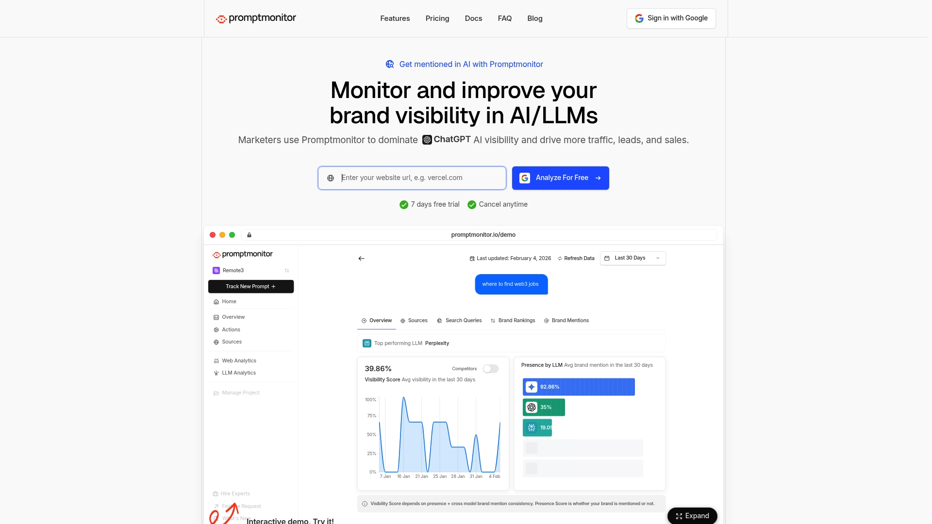 Promptmonitor es una herramienta GEO diseñada para monitorear y mejorar la visibilidad de marca en LLMs y asistentes como ChatGPT, Claude y Gemini. Ofrece puntuación de visibilidad en AI, datos actualizados diariamente y analítica en tiempo real sin depender de cookies. Es especialmente útil para empresas que buscan entender cómo aparecen en respuestas generadas por AI y planear acciones de outreach. Ideal para equipos con foco en contenido y SEO orientado a AI.
