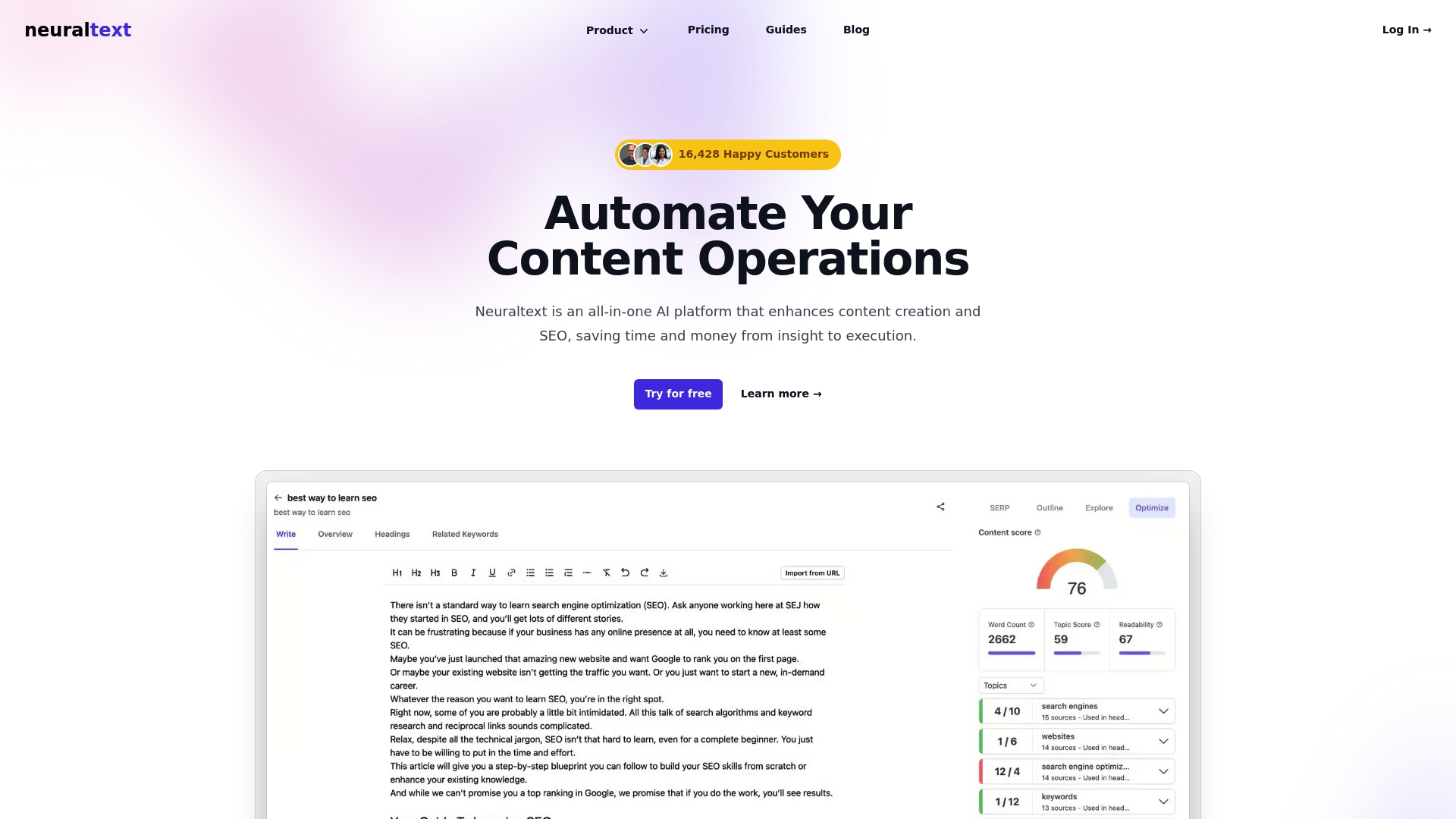 La forza di NeuralText sta nell'accoppiare brief basati su SERP con strumenti di scrittura AI e l'integrazione con Google Search Console. Questa combinazione riduce il lavoro manuale tra analisi e produzione e rende più immediata la trasformazione degli insight in articoli ottimizzati.