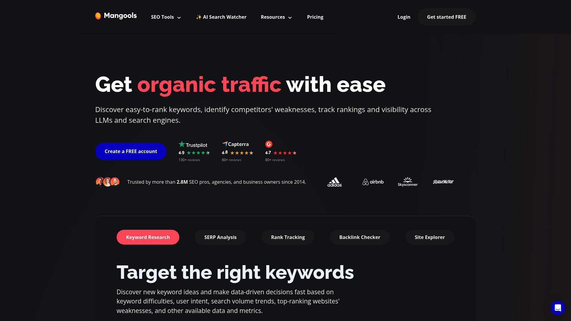 Mangools è una suite SEO pensata per semplificare attività pratiche come ricerca keyword, analisi SERP, monitoraggio posizioni e controllo backlink. L'interfaccia è intuitiva e il pacchetto include strumenti dedicati per ogni fase del lavoro SEO. Il team offre risorse gratuite e supporto dagli esperti per chi deve aumentare traffico organico senza complicazioni tecniche. Takeaway: ottimo per chi cerca strumenti concreti e facili da usare.