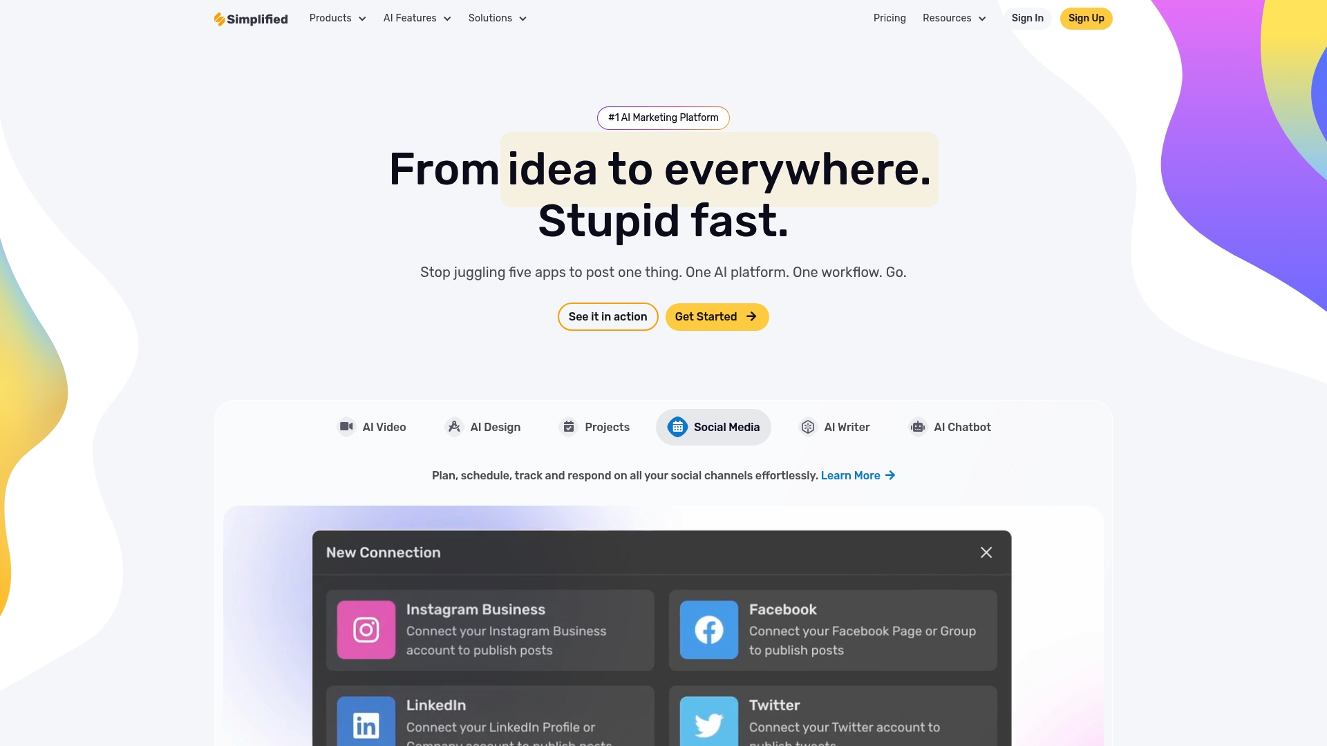 La force de Simplified réside dans la combinaison de multiples outils de contenu avec une couche IA commune. Au lieu d'assembler plusieurs logiciels, vous obtenez design, rédaction, vidéo et planification sociale dans un seul espace. Résultat: flux de travail plus cohérent et moins de friction administrative.