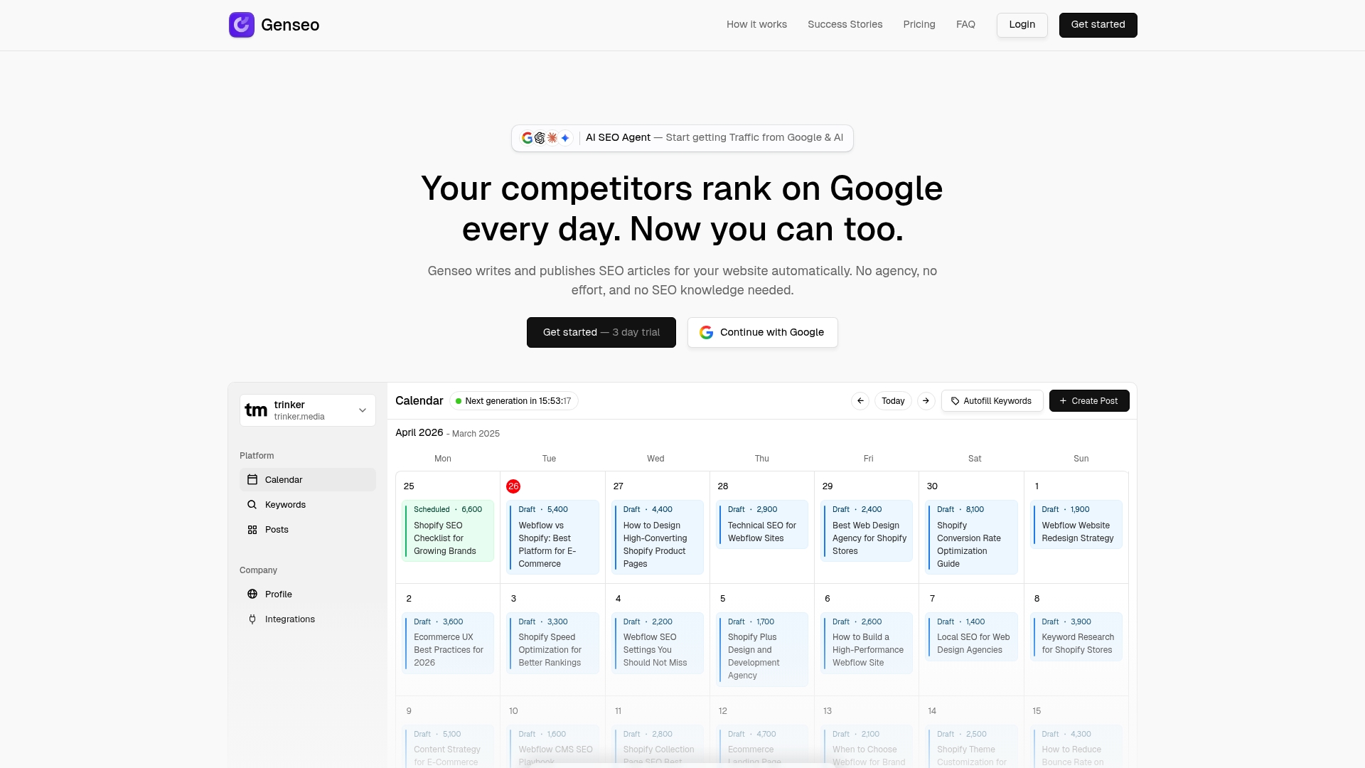 Genseo automaticky vytváří a publikuje SEO články na váš web tak, aby zvyšoval viditelnost na Google bez rozsáhlých znalostí SEO. Celkově jde o řešení orientované na šetření času pro vlastníky e‑shopů a agentury, kteří potřebují pravidelný obsah bez manuální práce.