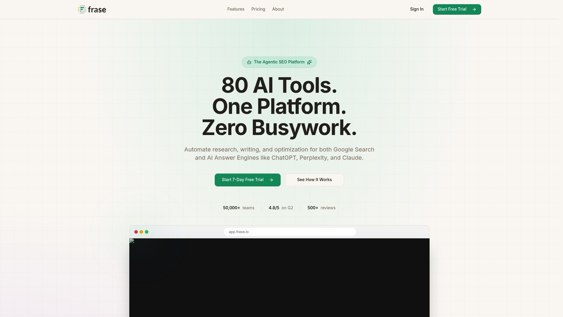 Frase je agentní SEO platforma která automatizuje výzkum, psaní a optimalizaci pro Google Search a AI odpovědní platformy jako ChatGPT, Perplexity a Claude. Bottom line: silný nástroj pro týmy, které chtějí zvýšit výstup obsahu bez navyšování headcountu.