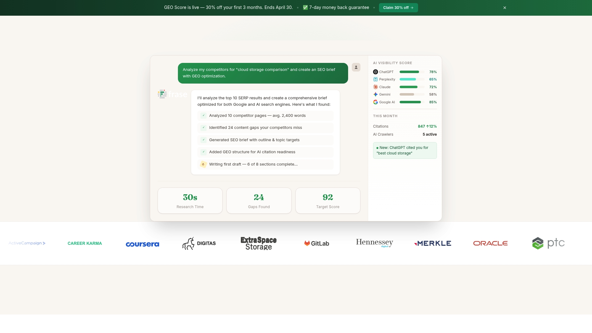 Frase łączy agenticzną automatyzację SEO z monitorowaniem widoczności w Google i AI, oferując jedną platformę do badań, tworzenia i optymalizacji treści. To narzędzie zaprojektowane dla zespołów, które chcą działać szybciej i z mniejszą liczbą manualnych zadań.