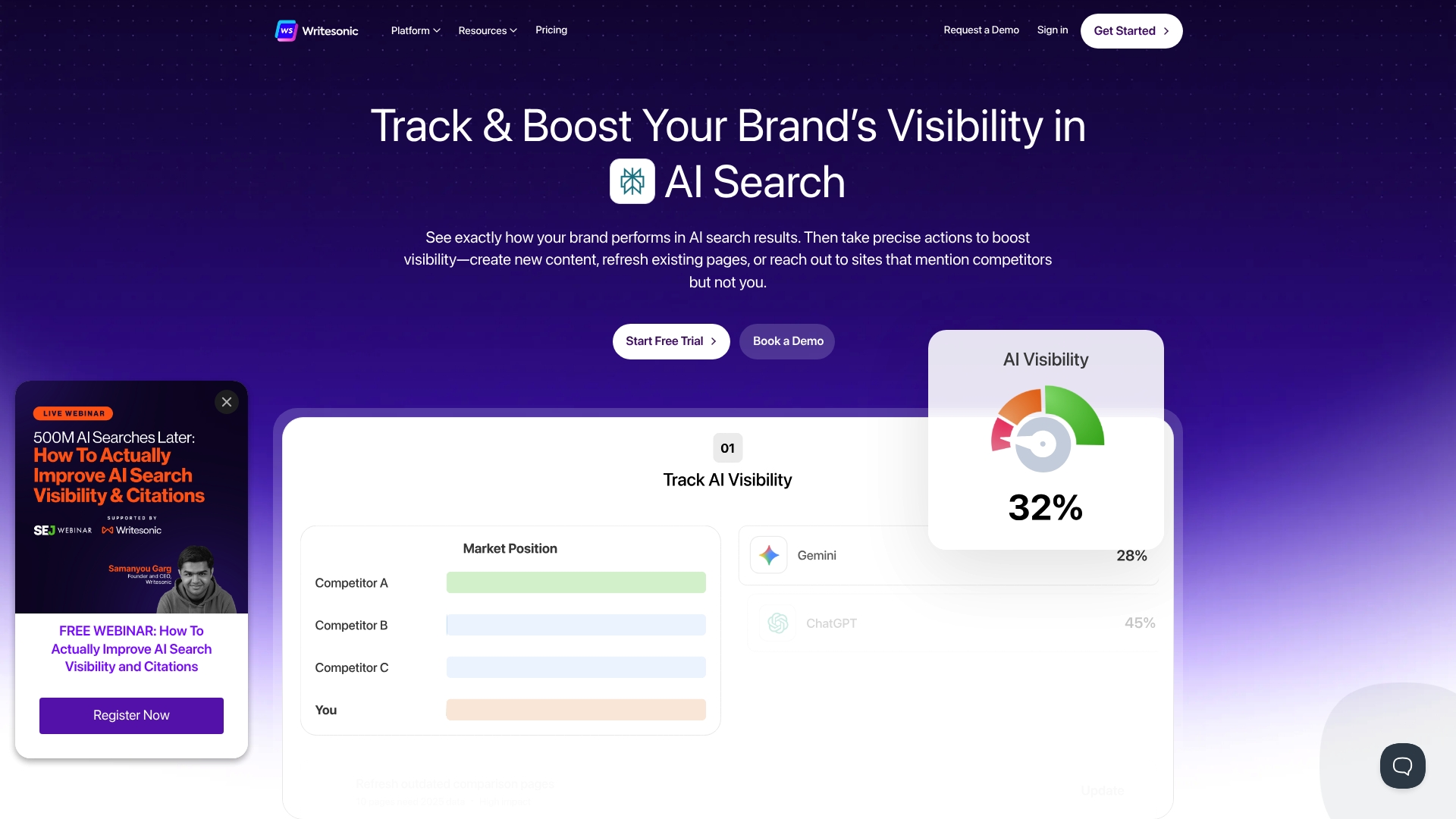 Writesonic łączy szeroki zestaw narzędzi AI do monitoringu widoczności, tworzenia treści i automatycznej optymalizacji SEO w jednym miejscu. To trafny wybór dla zespołów marketingowych, które potrzebują monitorować obecność na ChatGPT i Google oraz automatyzować przepływy pracy.