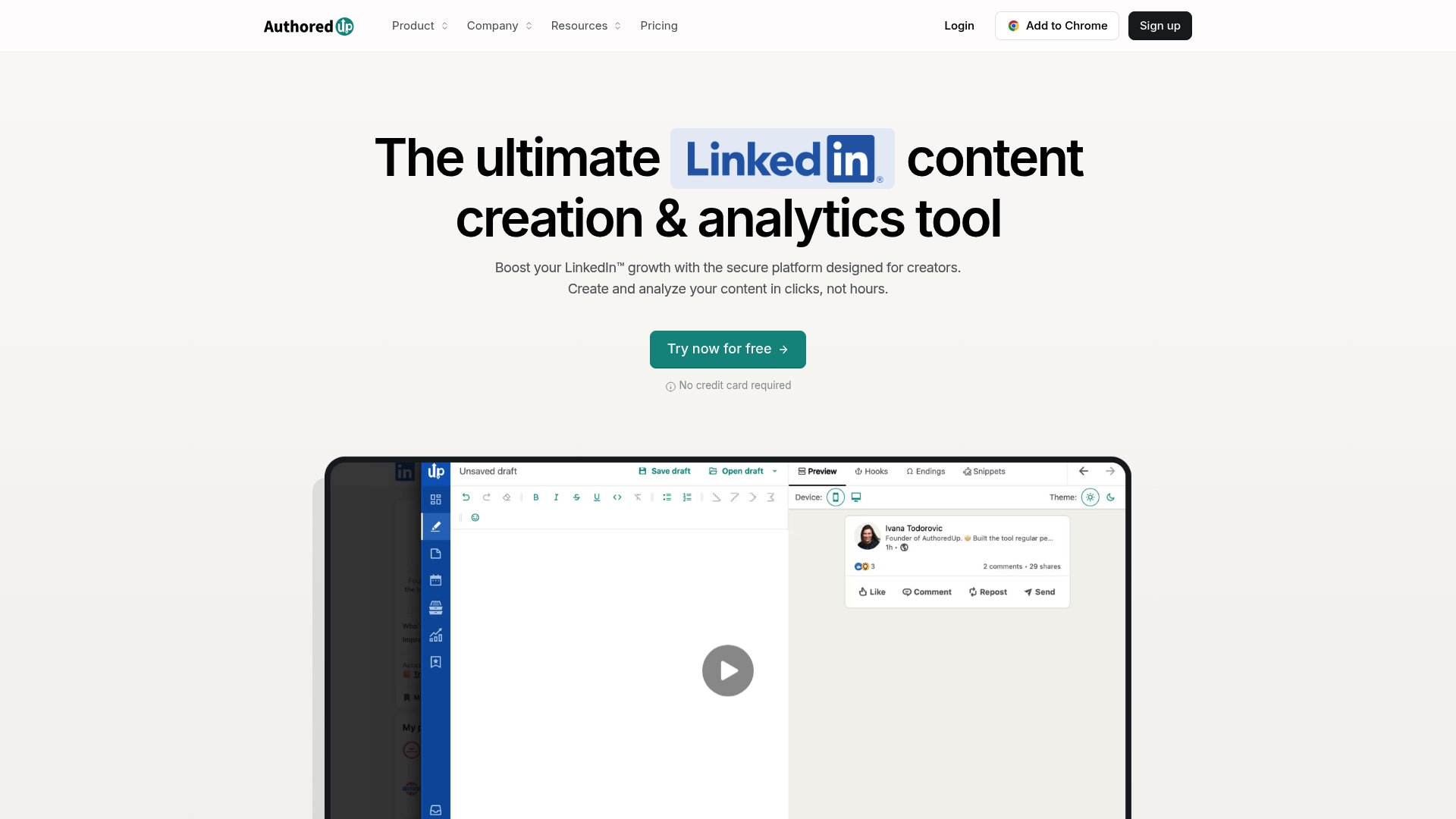 AuthoredUp é uma ferramenta completa para criação e análise de conteúdo no LinkedIn concebida para criadores, equipas e empresas. Oferece editor de publicações, calendário e métricas que ajudam a planear e a medir resultados com clareza. A sua aposta em privacidade e conformidade GDPR torna-a atraente para empresas que tratam dados sensíveis. No geral é uma solução robusta para quem quer crescer no LinkedIn sem dispersar recursos.